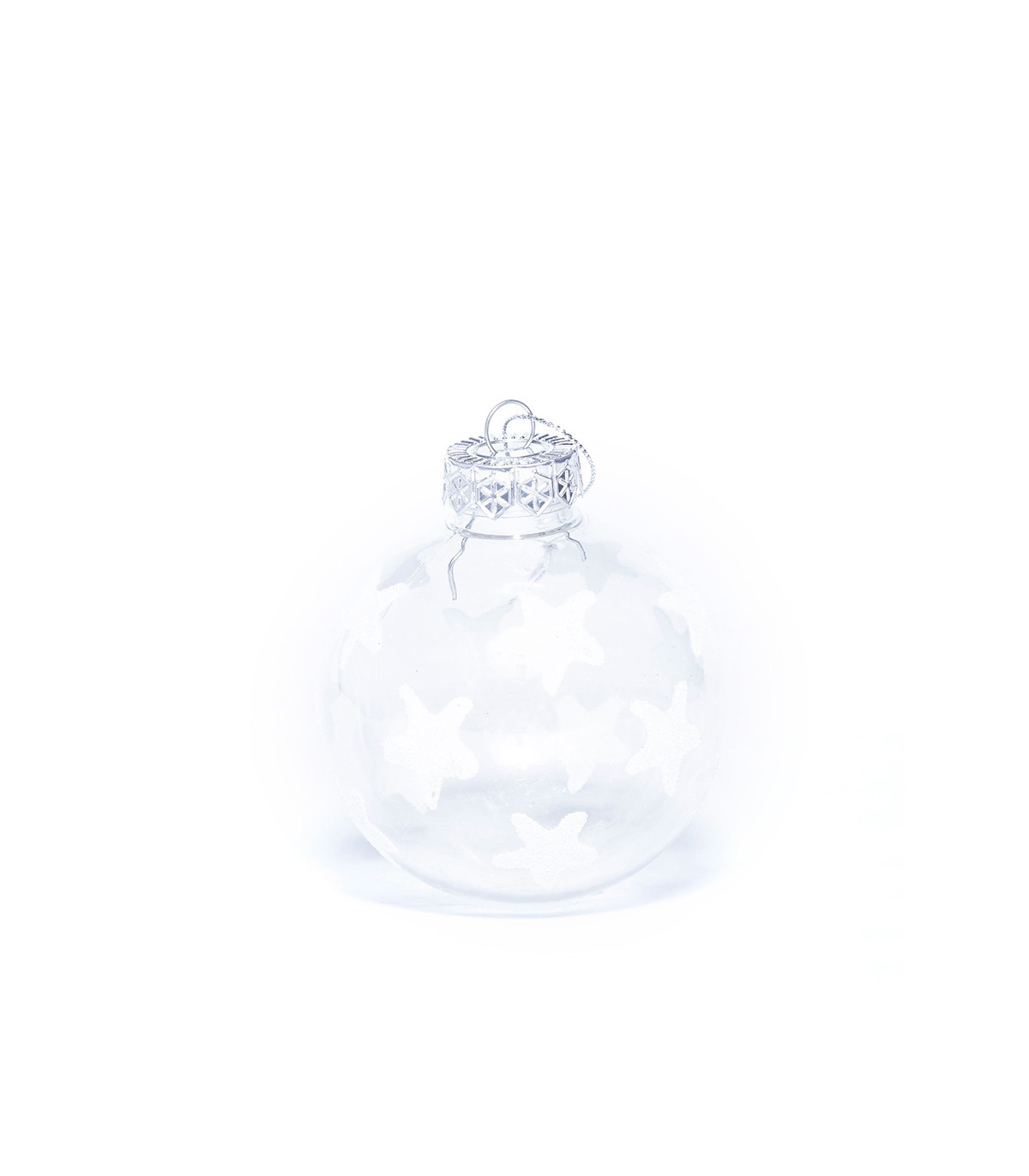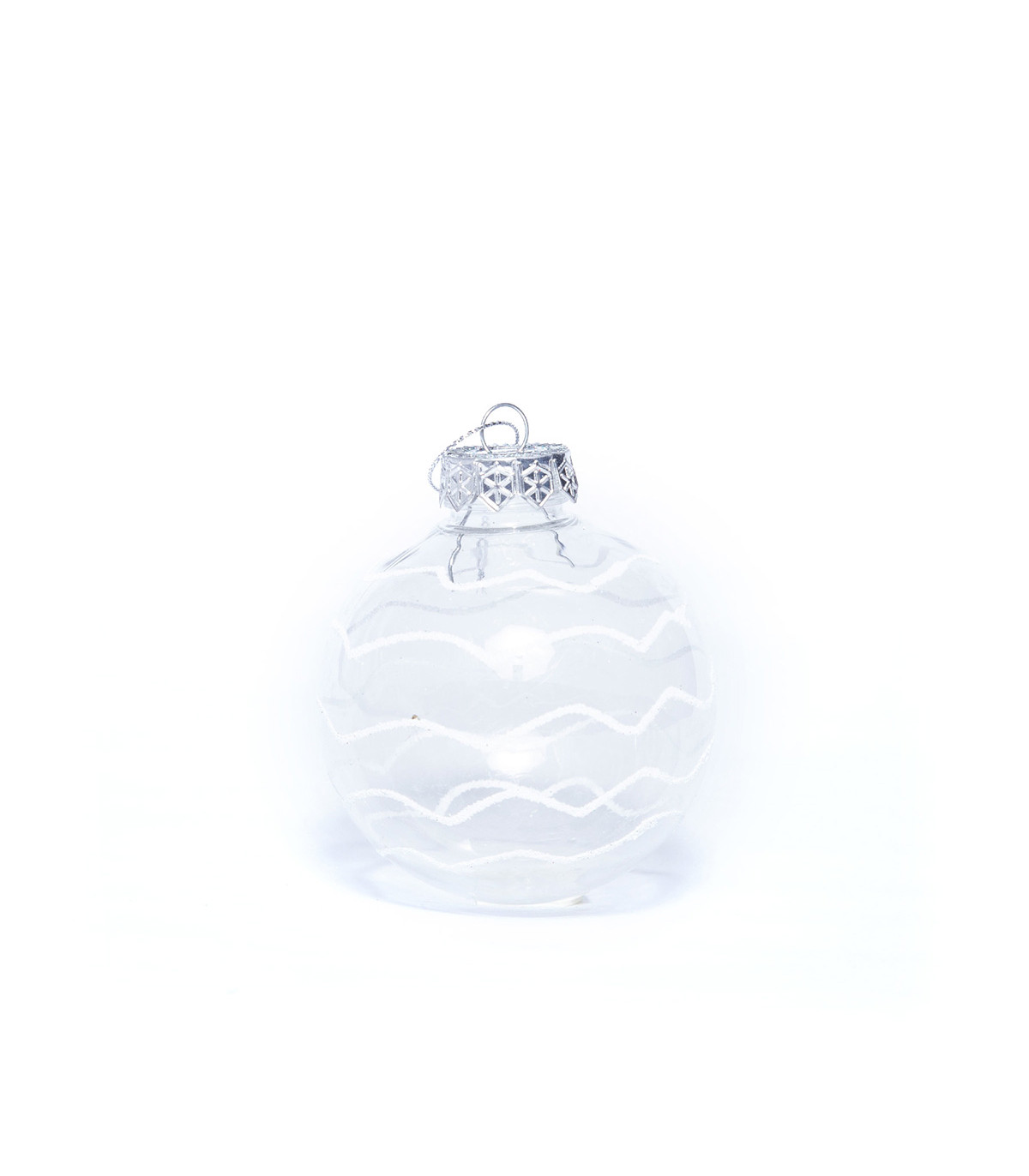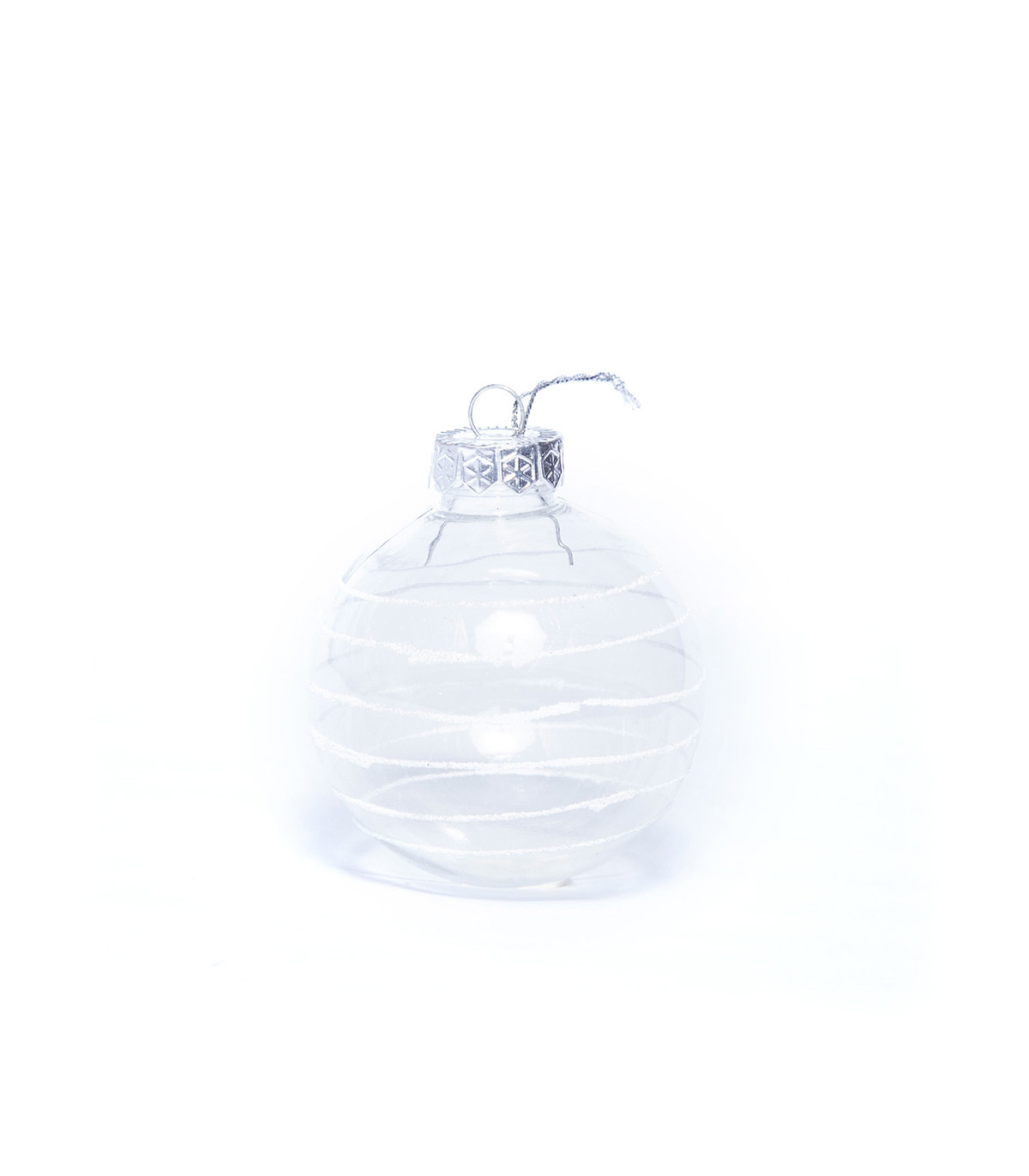 Una bola de plástico transparente de 8 cm de diámetro con copos de nieve blancos para decorar el árbol de Navidad.