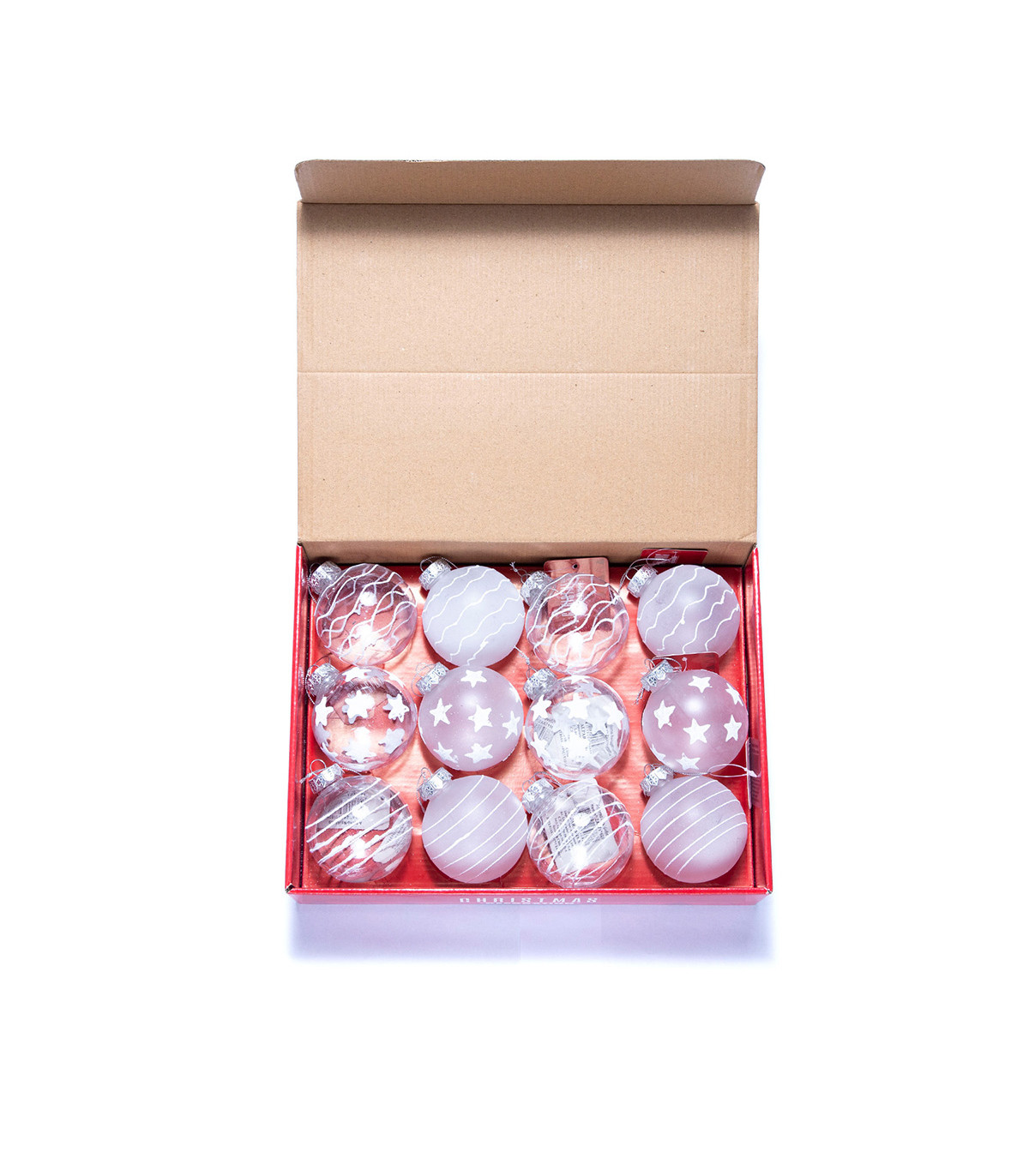 12 bolas navideñas plásticas de 6 cm de diámetro para decorar el árbol de Navidad con toda la magia de Alparamis. Vienen en una caja de acetato transparente.