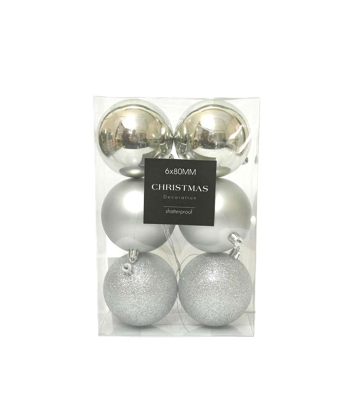 6 bolas navideñas plásticas de 8 cm de diámetro para decorar el árbol de Navidad con toda la magia de Alparamis. Vienen en una caja de acetato transparente.