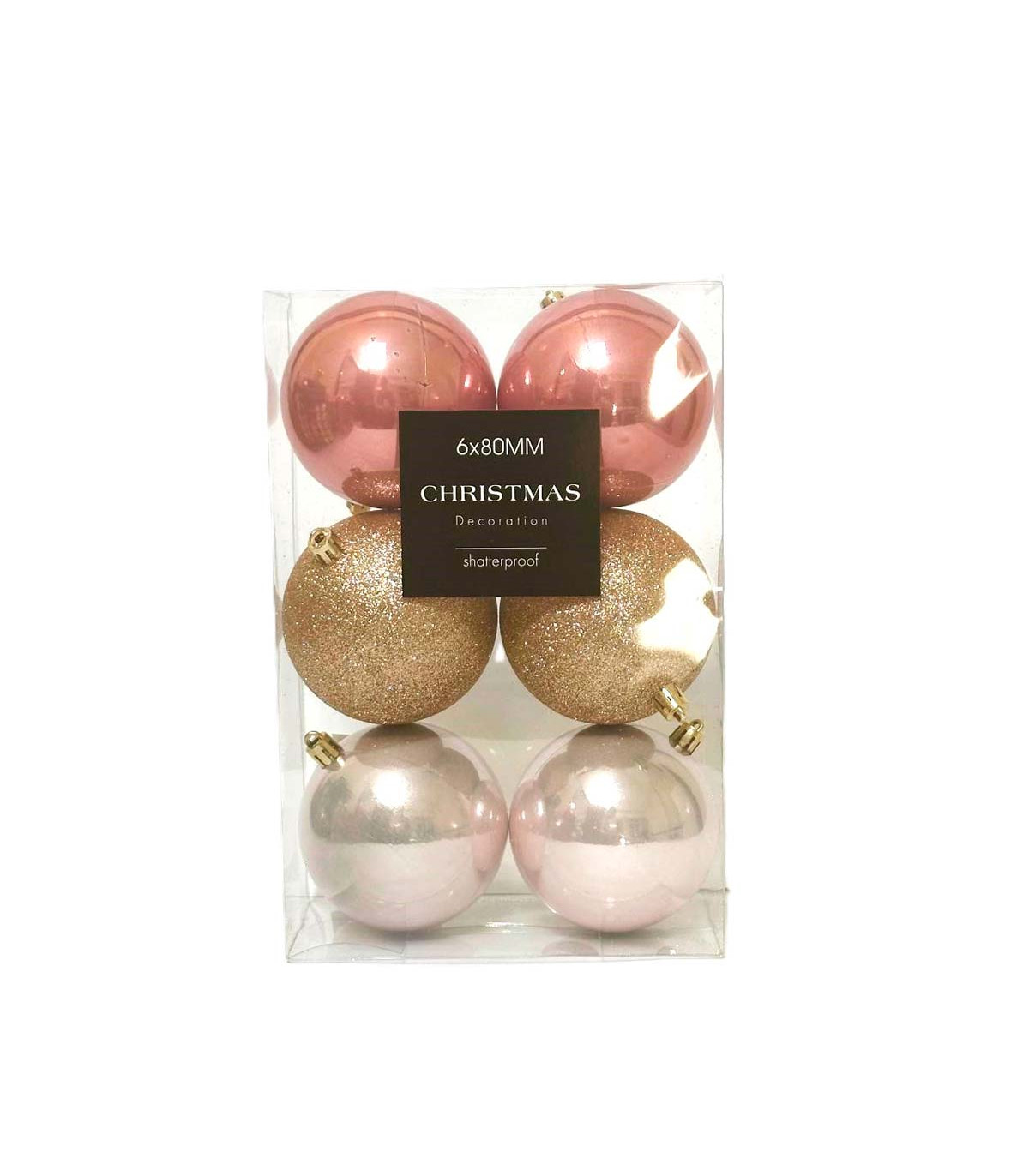 6 bolas navideñas plásticas de 8 cm de diámetro para decorar el árbol de Navidad con toda la magia de Alparamis. Vienen en una caja de acetato transparente.