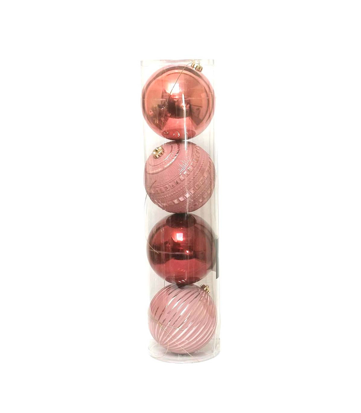 4 bolas navideñas plásticas de 15 cm de diámetro para decorar el árbol de Navidad con toda la magia de Alparamis. Vienen en una caja de acetato transparente.