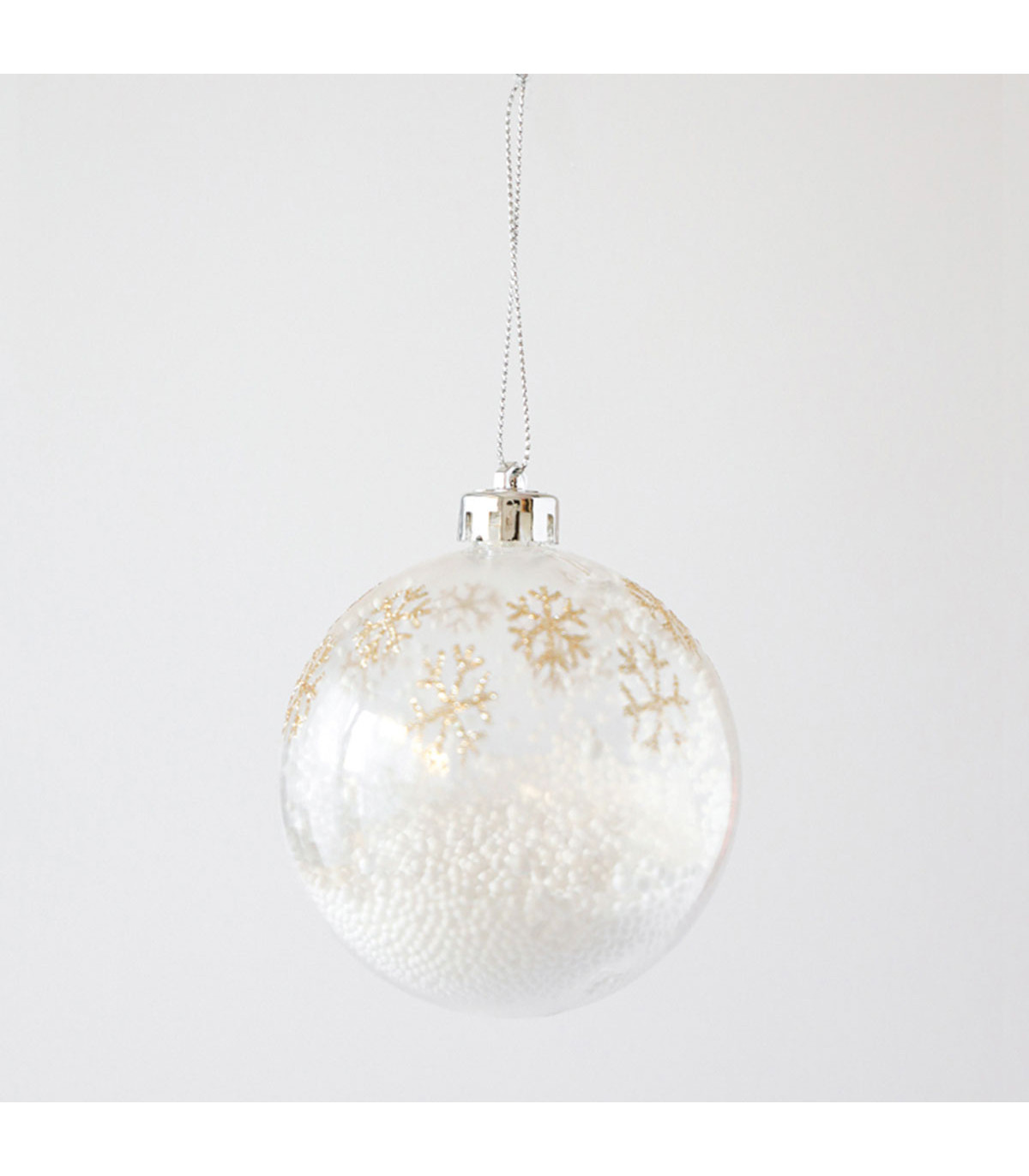 Una bola de plástico transparente de 8 cm de diámetro con copos de nieve dorados para decorar el árbol de Navidad.
