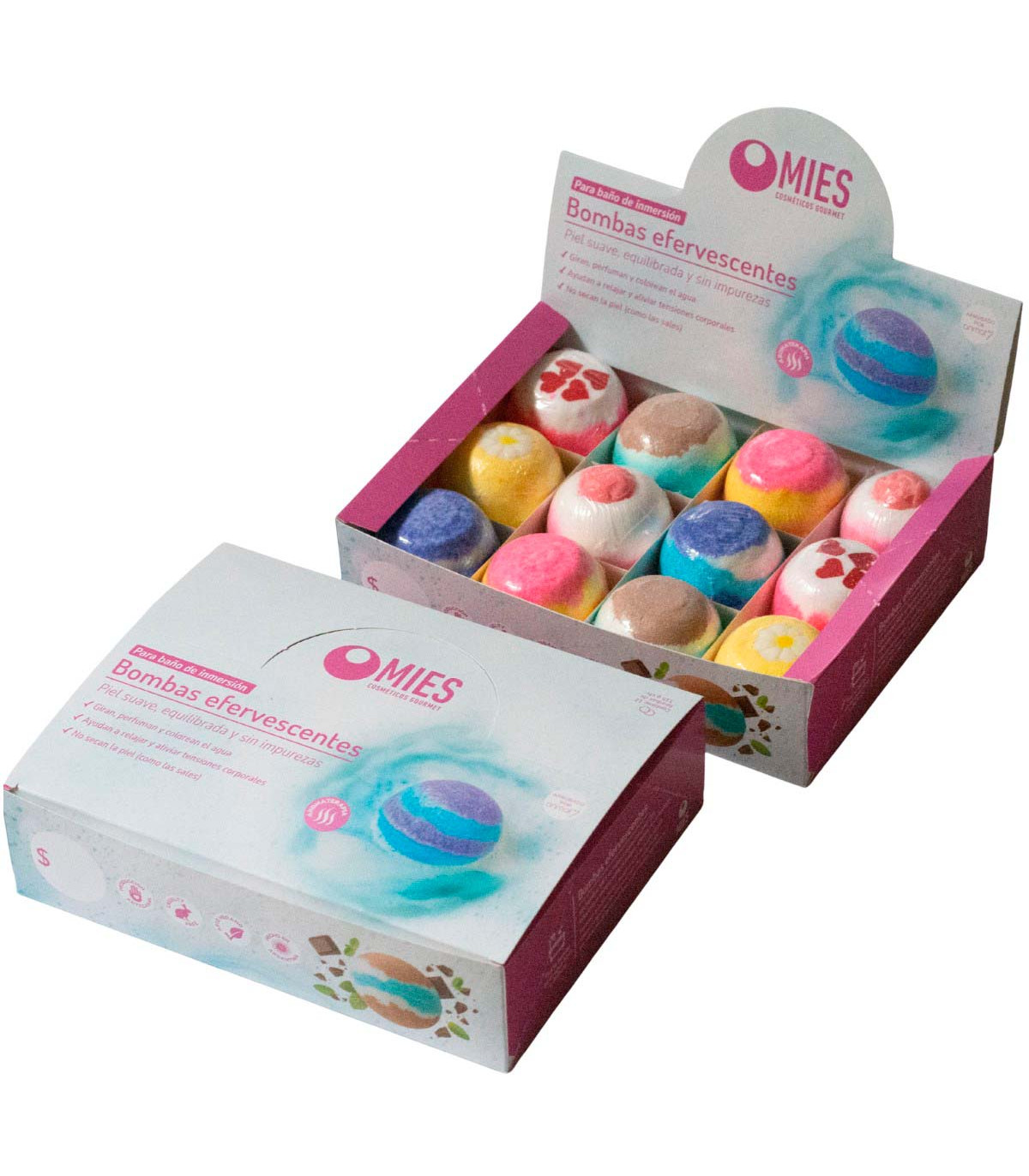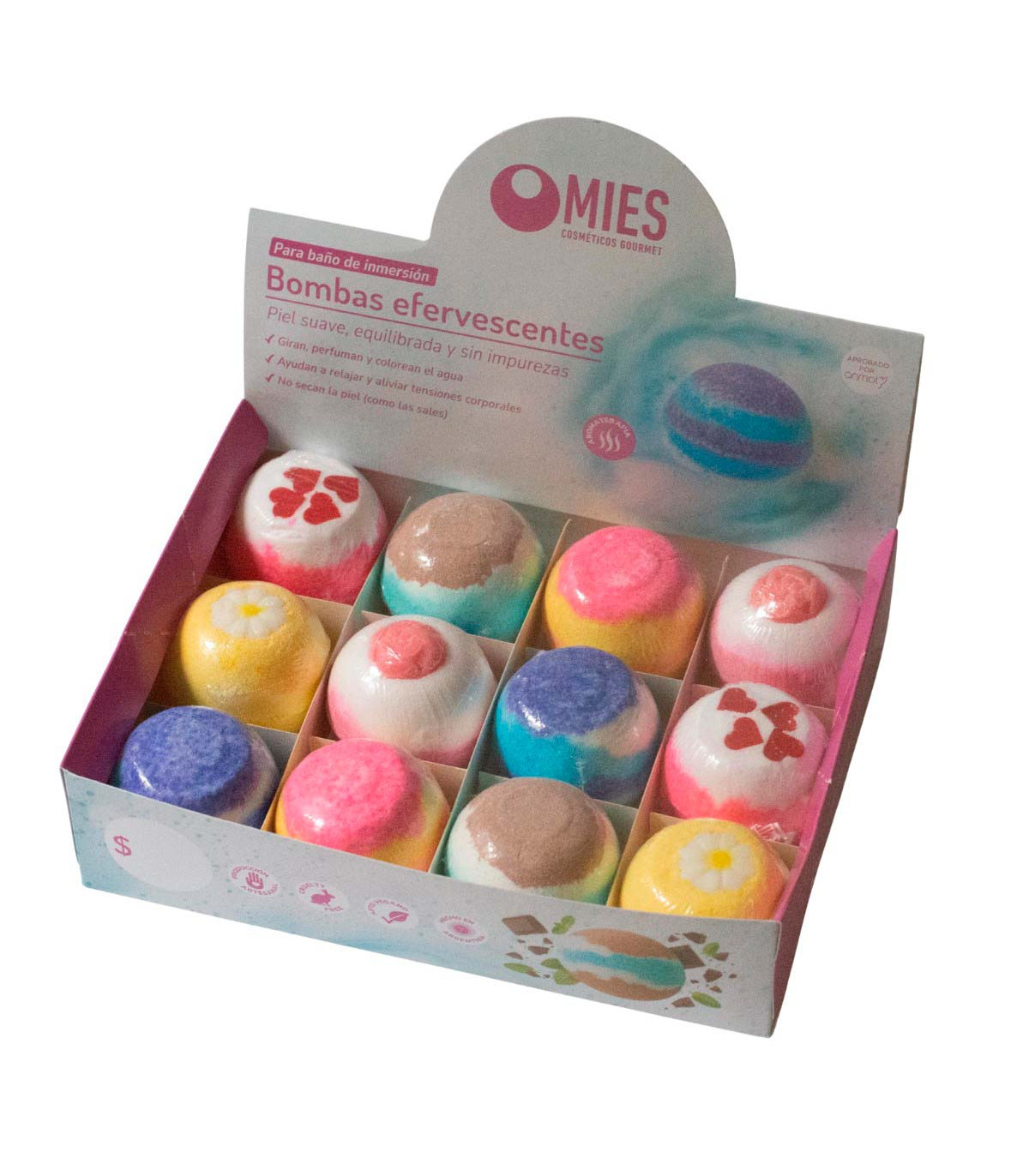 Una caja exhibidora que contiene 12 bombas efervescentes para la bañadera de 115 gramos cada una con las variedades más elegidas.