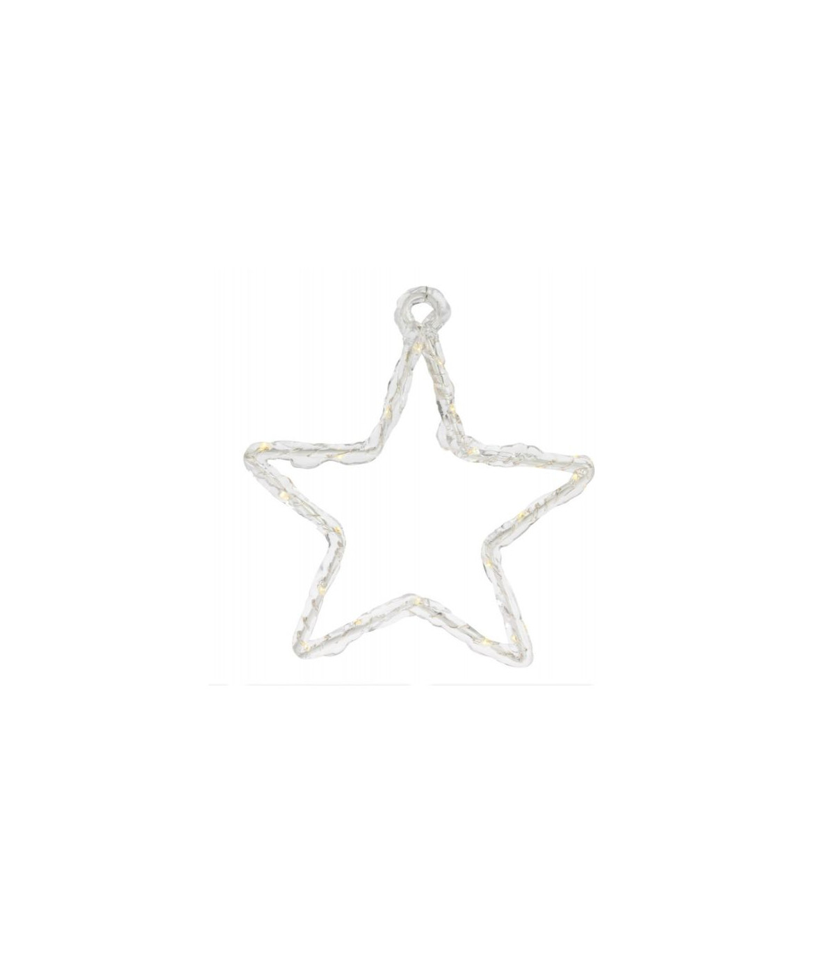 La estrella se puede colgar o colocar apoyada en algo. Para uso en interiores y al aire libre. La estructura en forma de estrella está hecha de un marco de metal recubierto de acrílico transparente con lámparas LED en su interior.