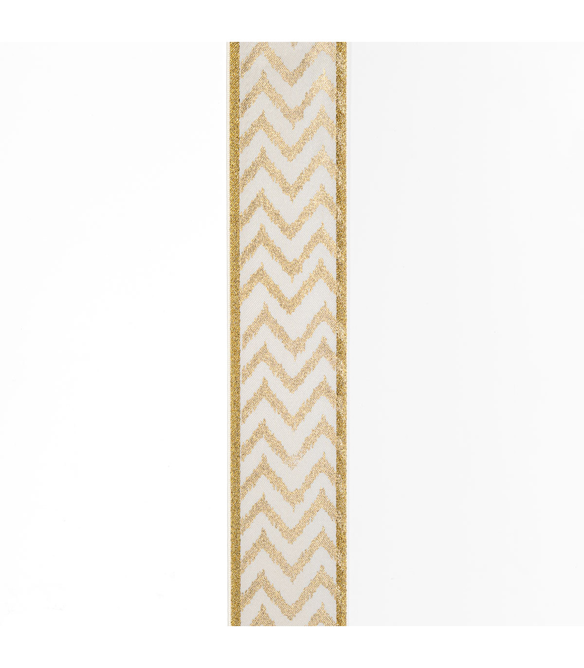 Una cinta decorativa de tela de 8.9 cm de ancho y 10 metros de largo con 7 diseños surtidos en tonos de dorado para decorar en Navidad.