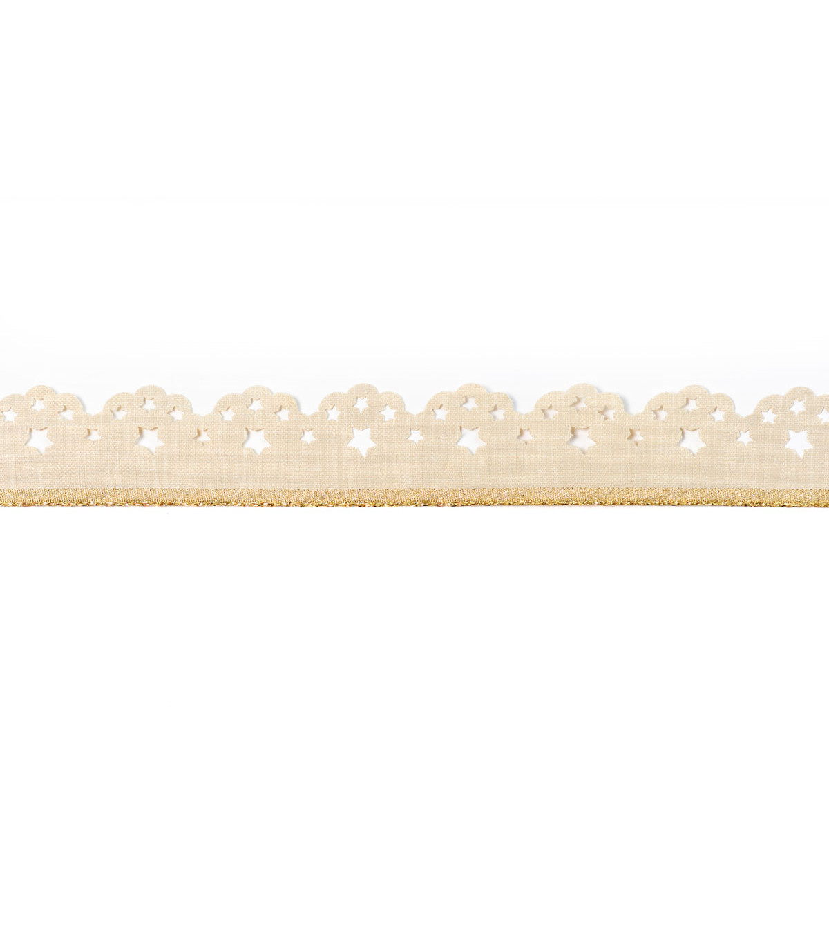Una cinta de tela con figuras de estrellas troqueladas, de 3.5 cm de ancho y 10 metros de largo para decorar. Ideal para decorar en Navidad.