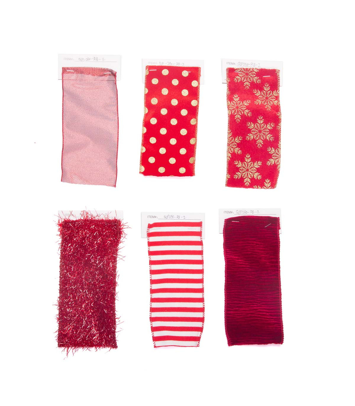 Una cinta decorativa de tela de 8.9 cm de ancho y 10 metros de largo con 7 diseños surtidos en tonos de rojo para decorar en Navidad.