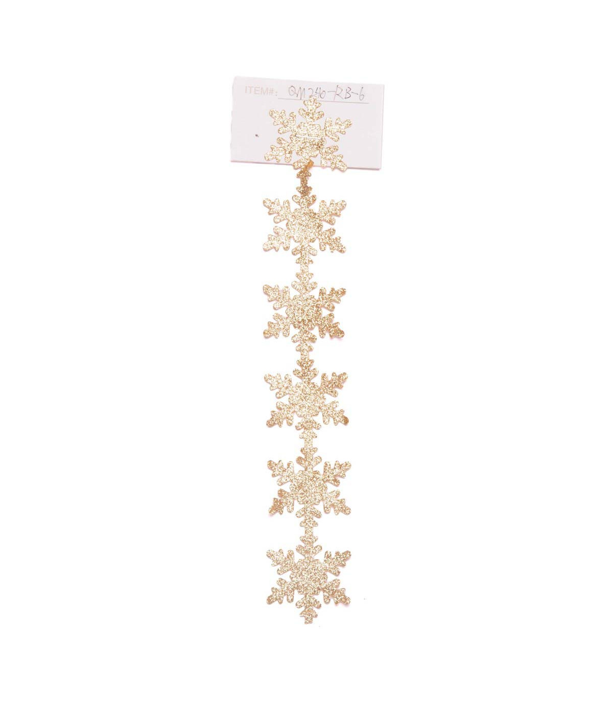 Una cinta decorativa de tela dorada de 3.8 cm de ancho y 9 metros de largo con formas de copo de nieve caladas.