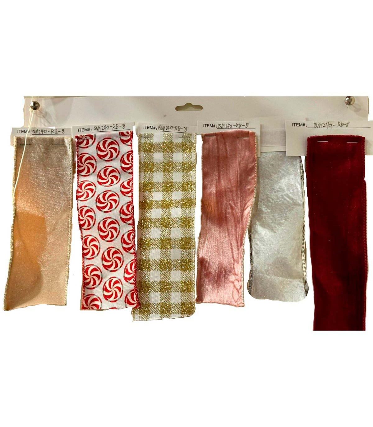 Una cinta decorativa de tela de 6.3 cm de ancho y 9 metros de largo con 6 diseños surtidos en tonos de rojo, dorado, plateado y blanco para decorar en Navidad.