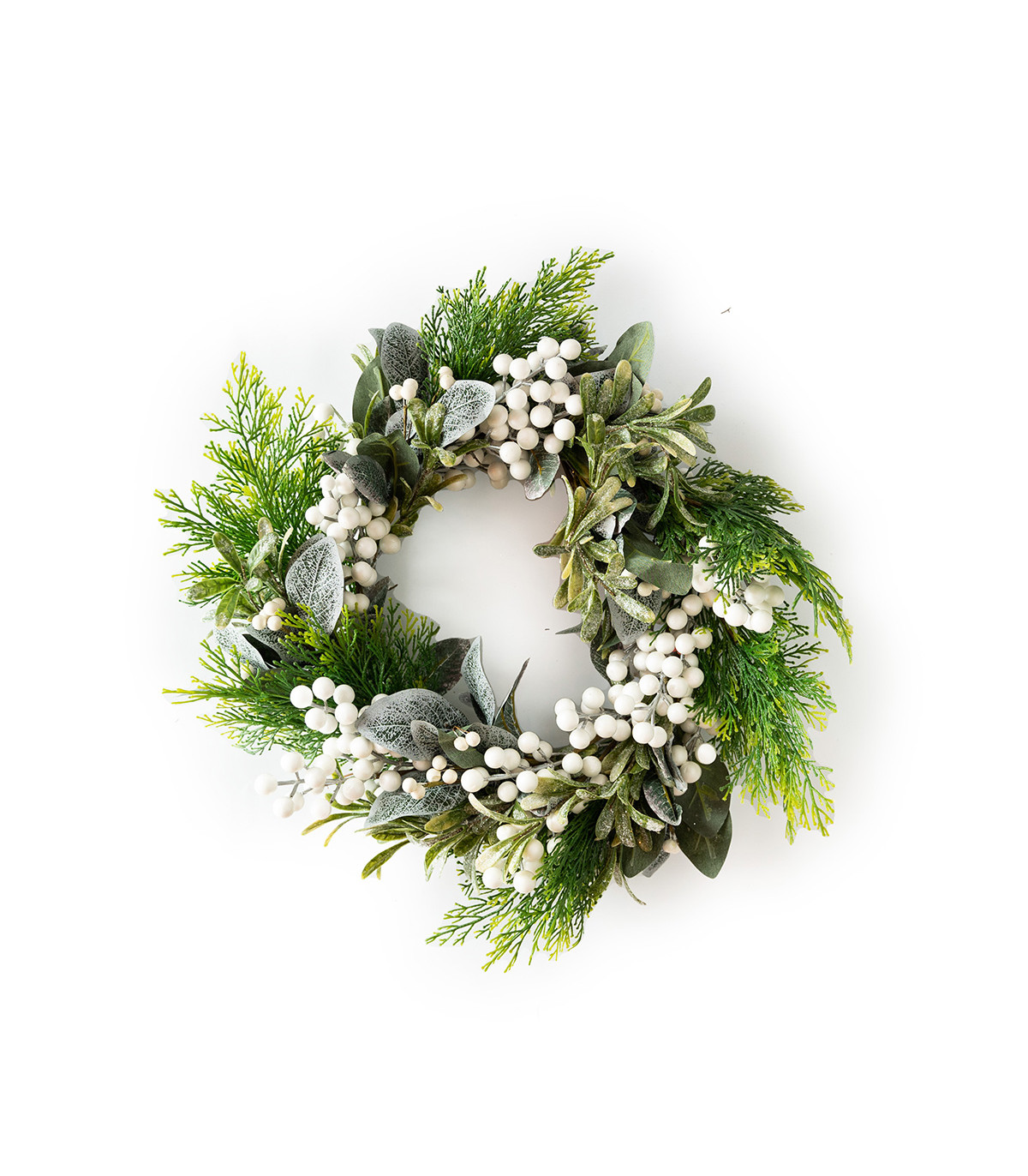 Una corona de 51 cm de diámetro con hojas verdes y frutos blancos artificiales, para decorar tu casa en Navidad con toda la magia de Alparamis.
