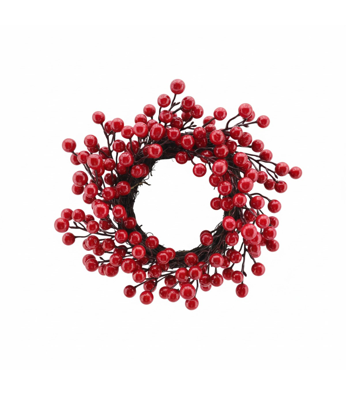 Una corona navideña de frutas rojas de 56 cm de diámetro. Estilo natural y elegante para decorar puertas o paredes con espíritu navideño clásico.