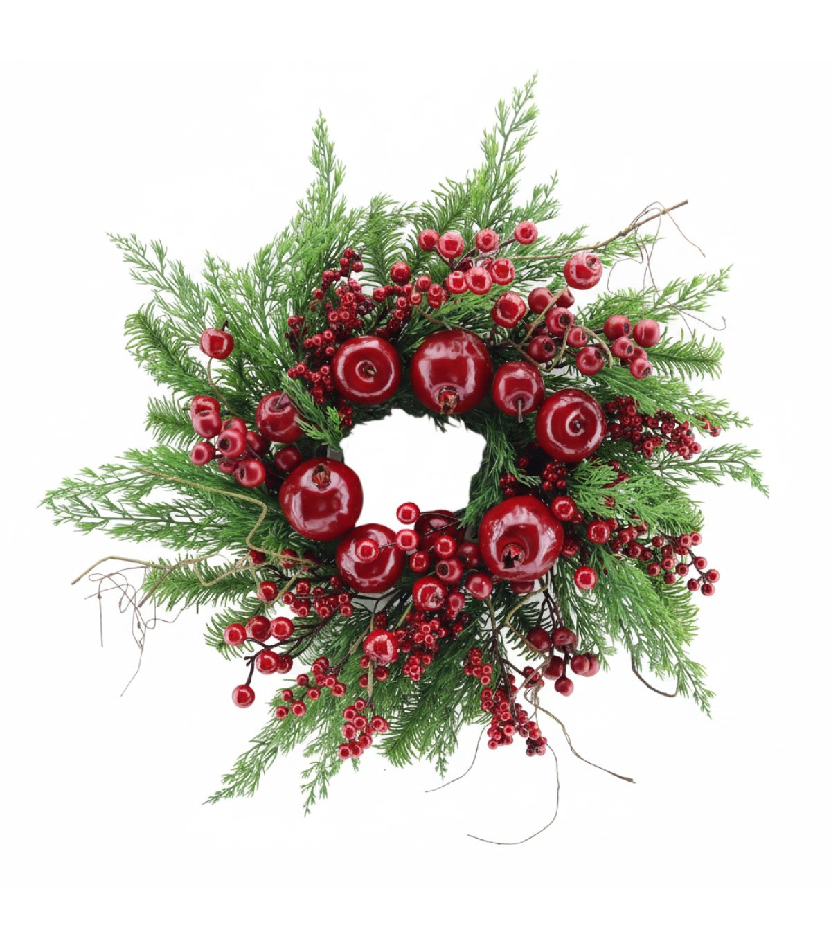 Una corona navideña de frutas rojas de 56 cm de diámetro. Estilo natural y elegante para decorar puertas o paredes con espíritu navideño clásico.