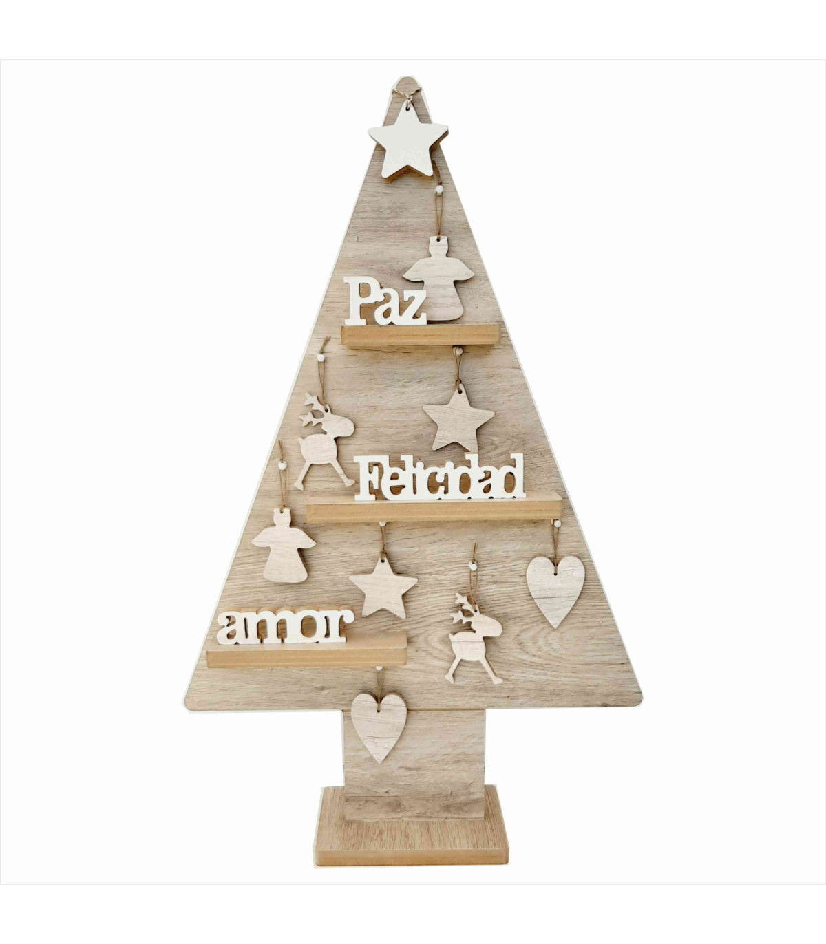 Un adorno de arbolito de Navidad de madera de 78 cm de alto y 50 cm de ancho, con repisas que contienen 12 figuras decorativas. Hecho en madera recuperada de los sobrantes de muebles hechos a medida. Viene en caja de cartón.