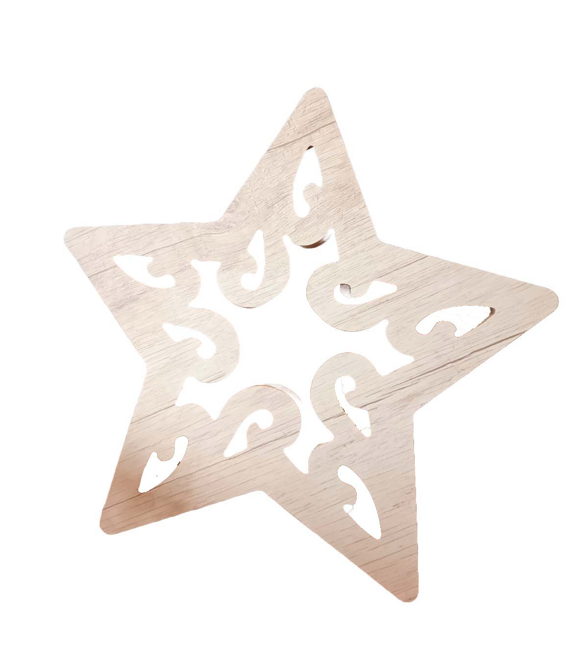 Un adorno con forma de estrella de madera calada, de 25 cm de diámetro para decorar en Navidad. Hecho en madera recuperada de los sobrantes de muebles hechos a medida.