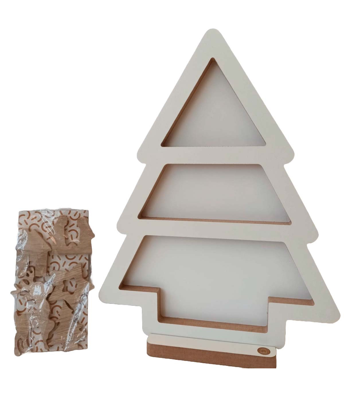 Un adorno de madera de 2 pinos y 1 corazón encastrables, uno adentro del otro, de 25 cm de alto y 21 cm de ancho. Ideal para decorar en Navidad.