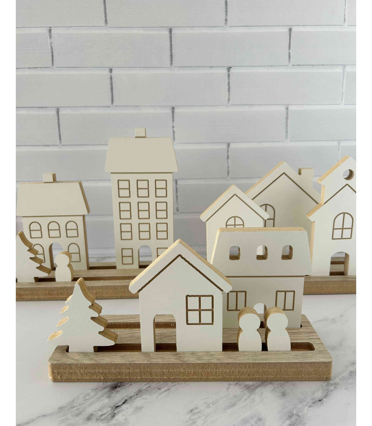 Un adorno de madera de una aldea navideña para decorar la casa en Navidad. Hechos en madera recuperada de los sobrantes de muebles hechos a medida.