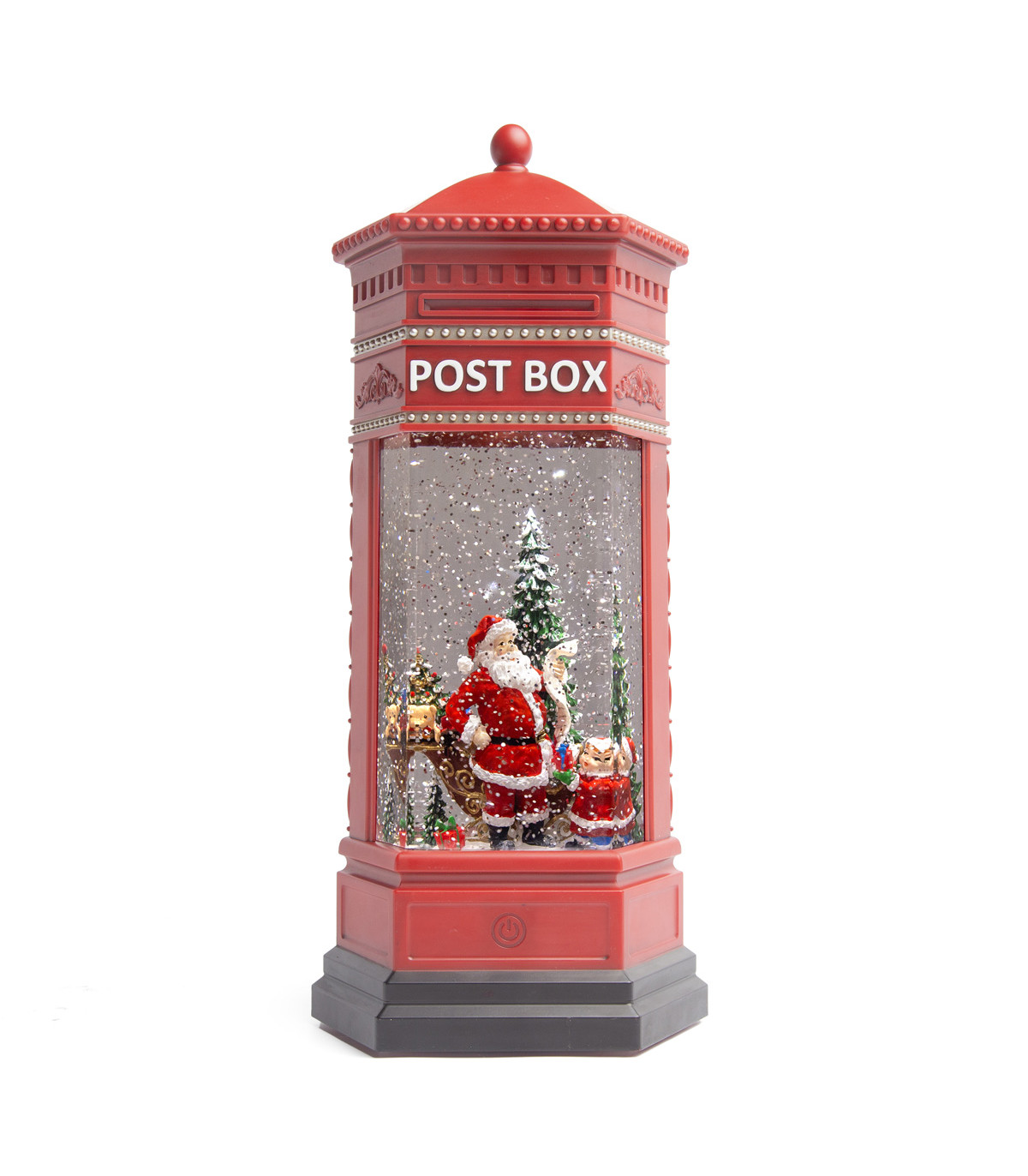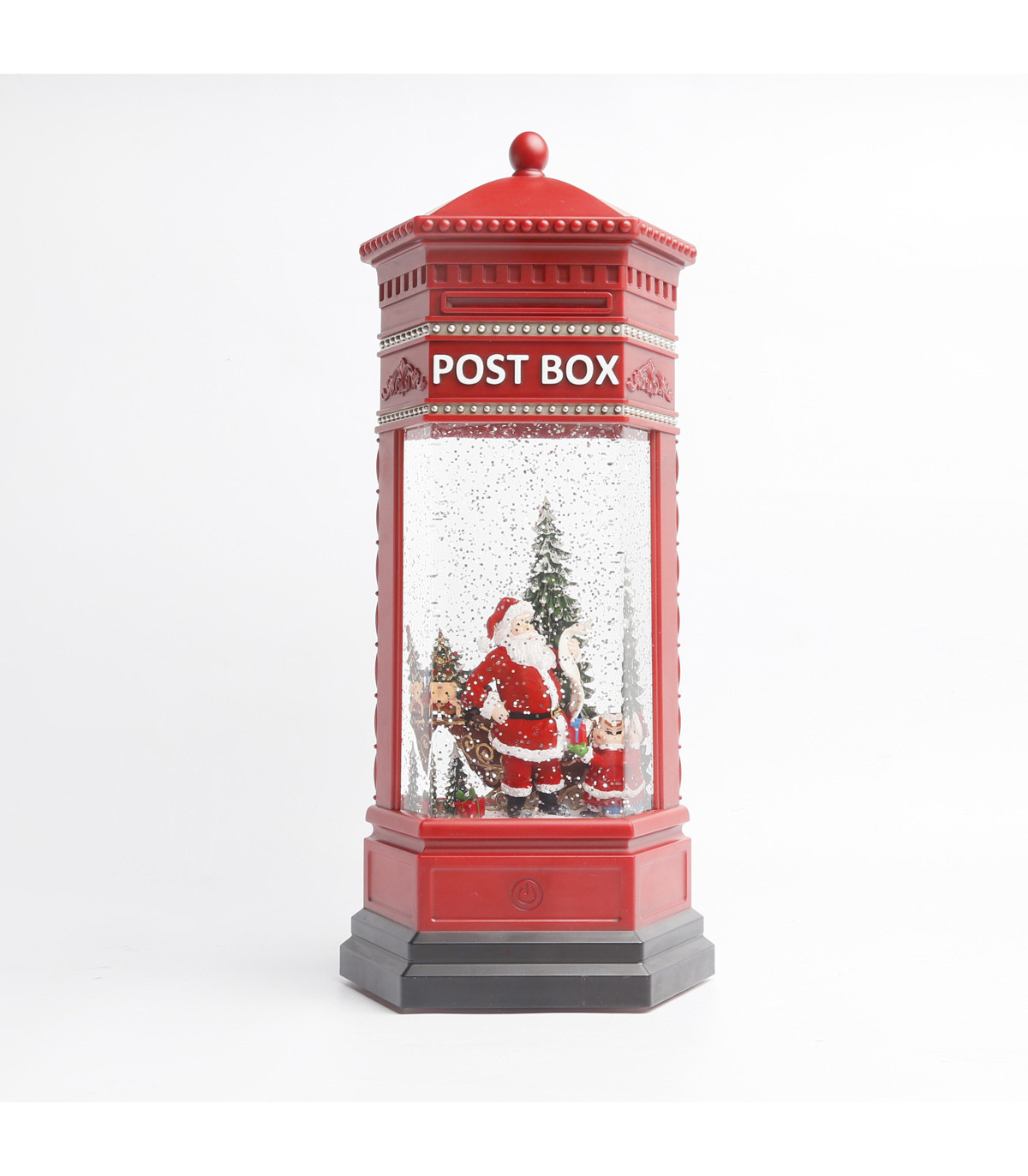 Un adorno de Navidad de 33 cm de alto en forma de buzón con una escena navideña de Papá Noel llena de agua y purpurina que al prenderla o agitarla parece nevar con luz LED a pilas (3 C no incluidas). Ideal para decorar tu casa en Navidad.