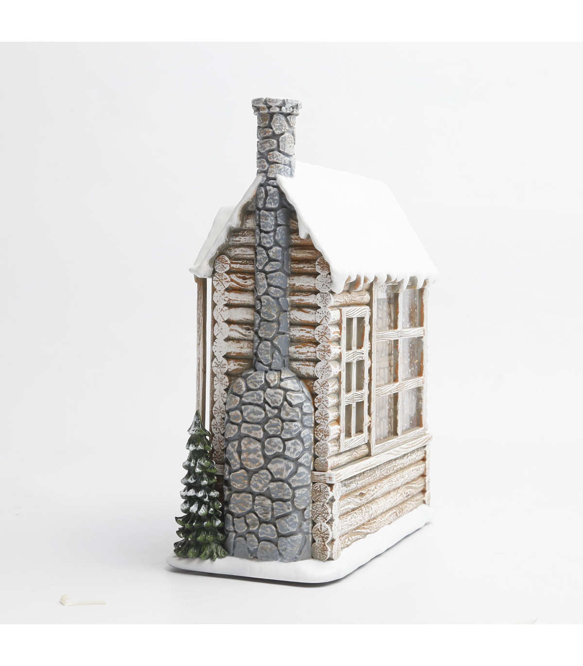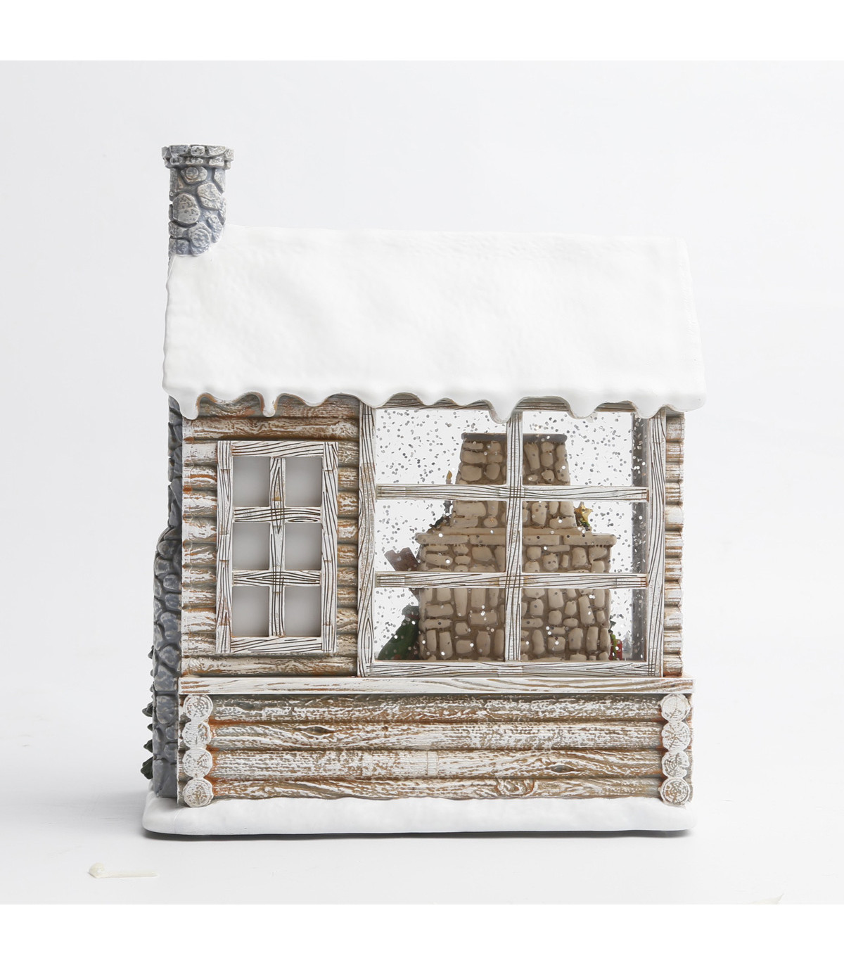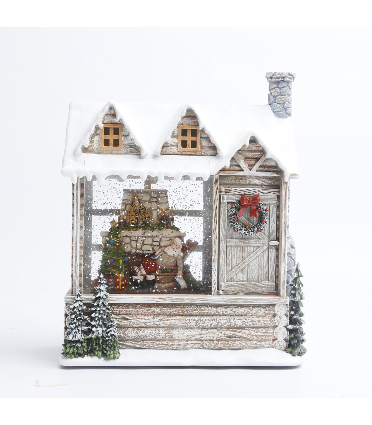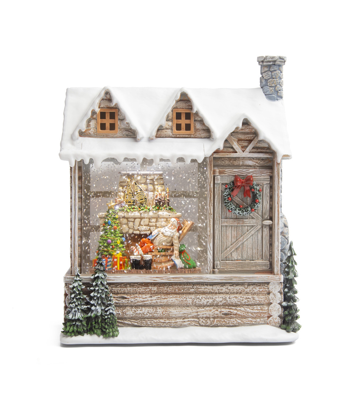 Un adorno de Navidad de 23 cm de alto en forma de cabaña con una escena navideña de Papá Noel llena de agua y purpurina que al prenderla o agitarla parece nevar y luz LED a pilas (3 AA no incluidas). Ideal para decorar tu casa en Navidad.