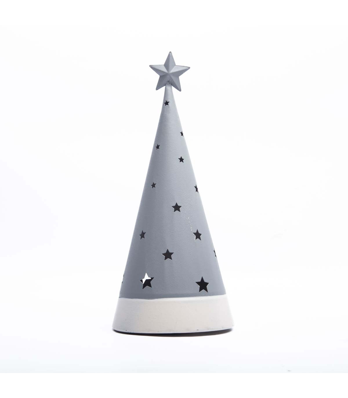 Un adorno de Navidad de resina de 25 cm de alto en forma de pino de Navidad decorado con estrellas caladas con luz LED a pilas en su interior. Ideal para decorar tu casa en Navidad.