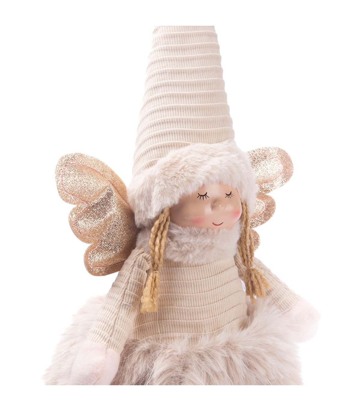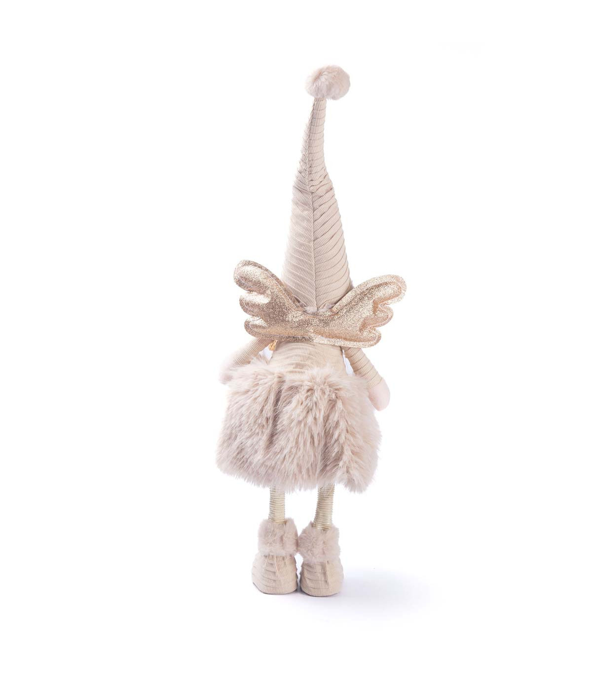 Un adorno con forma de angelito de 69 cm de alto hecho en tela. Con luz LED a pila (2 CR2032 no incluidas) y toda la magia de Alparamis para decorar tu casa en Navidad.