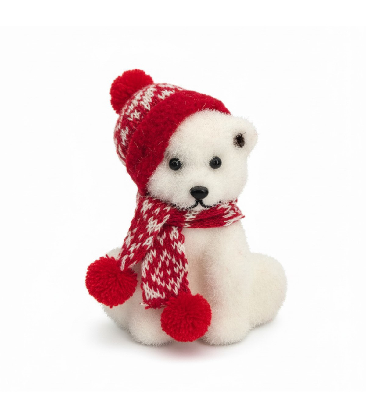 Un adorno navideño con forma de oso sentado de 12 cm de ancho y 12 cm de alto, ideal para estanterías o centros de mesa. Aporta calidez y ternura a cualquier espacio navideño o invernal.