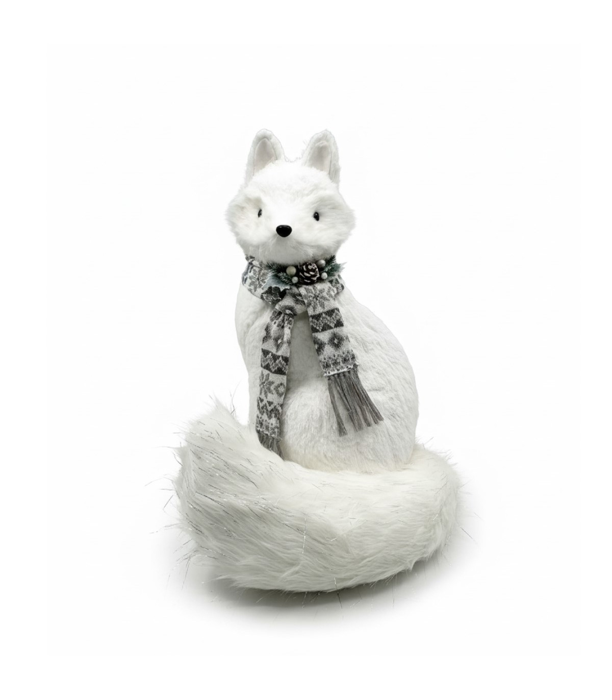 Un adorno navideño con forma de zorro blanco de 45 de ancho y 56 cm de alto, perfecto para una decoración navideña de estilo nórdico. Aporta elegancia y calidez a tu hogar en invierno.