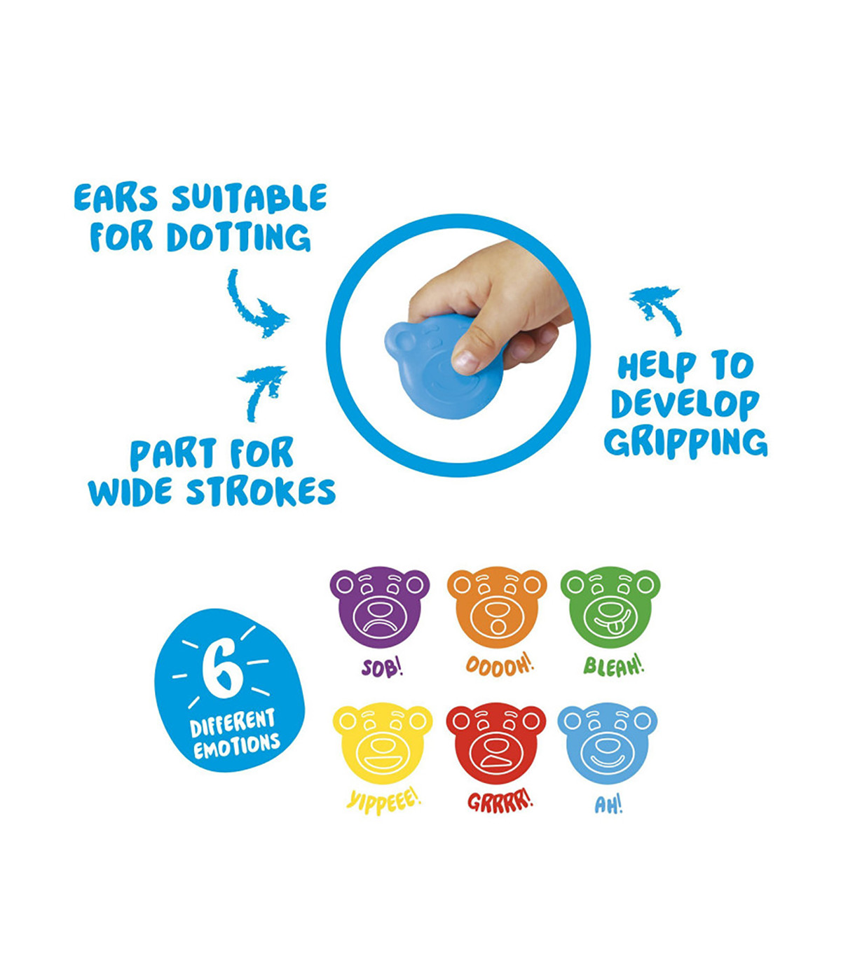 Caja de 6 crayones Teddy Baby con forma de osito para chicos a partir de los 12 meses. Diseñadas para entrenar el agarre digital de los bebés. Ayuda a estimular los primeros garabatos. Cada color está identificado con una emoción.