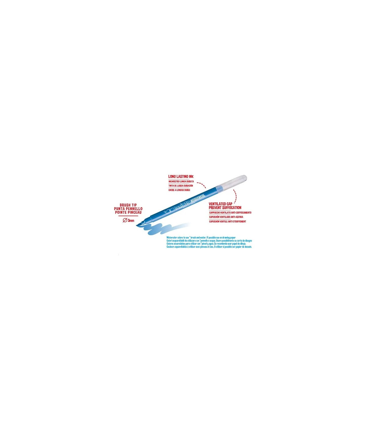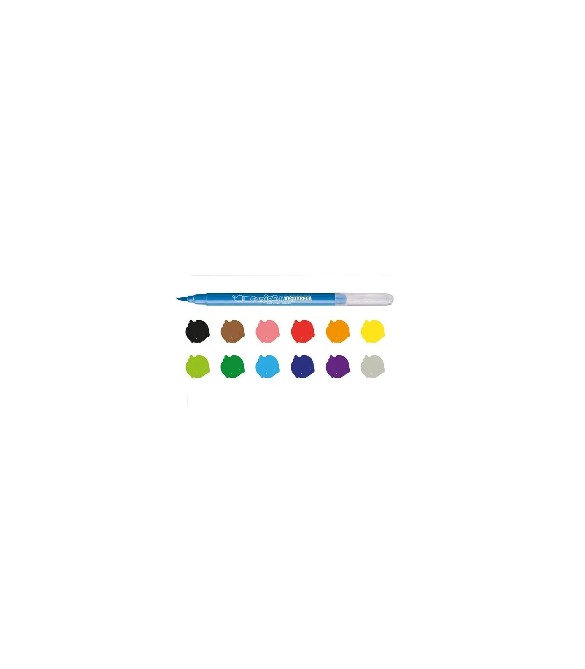 Una caja de 12 marcadores acuarelables con punta pincel bloqueado y tinta lavable. Utilizando agua y pincel se pueden difuminar los colores como si fuera una acuarela.