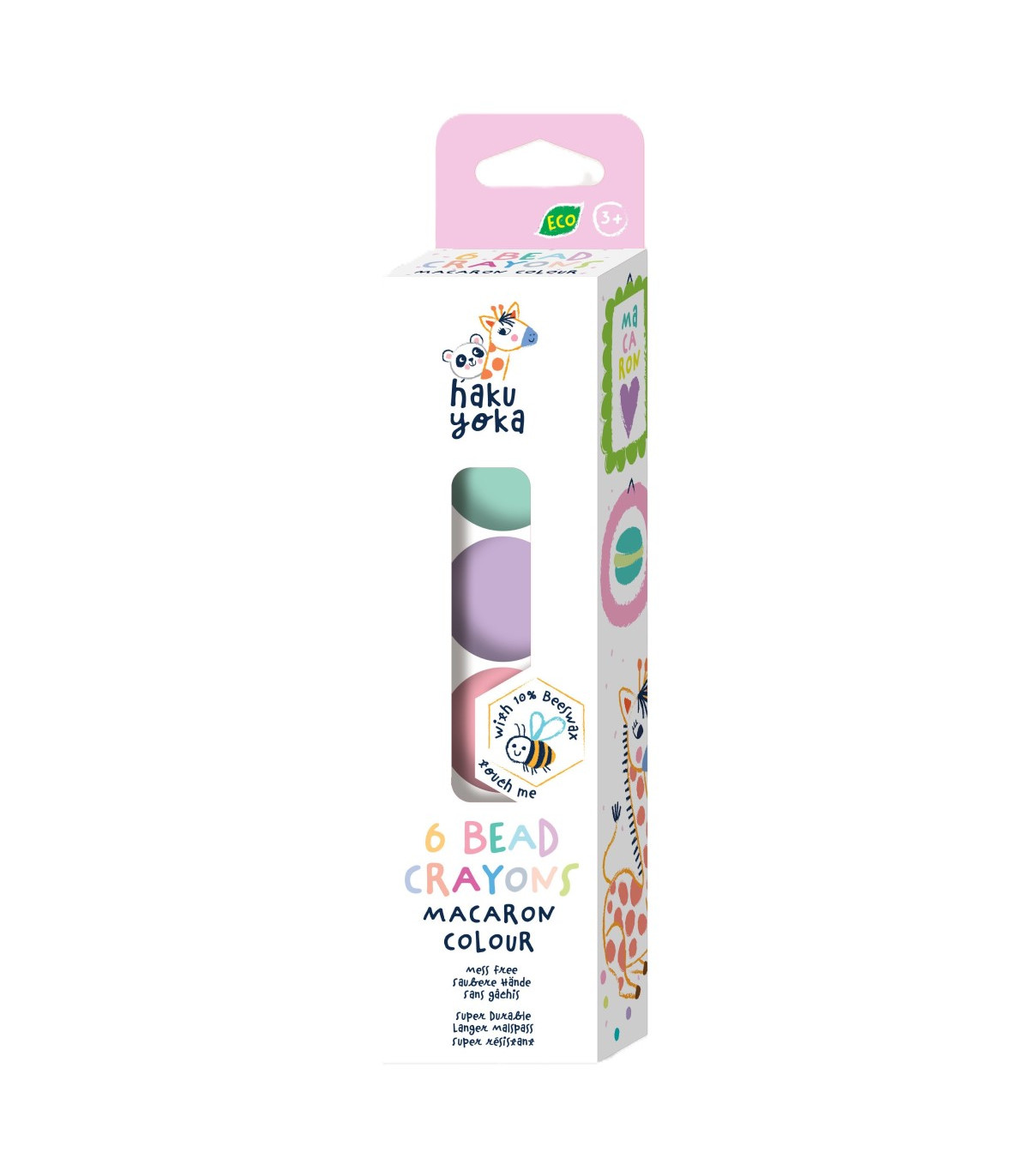 Un exhibidor con 20 unidades de cajas de 6 crayones con forma esférica y cúbica en 6 diseños surtidos. Diseñados para manos pequeñas. Hechos con un 10 % de cera de abejas, no ensucian y los materiales de papel tienen certificación FSC.