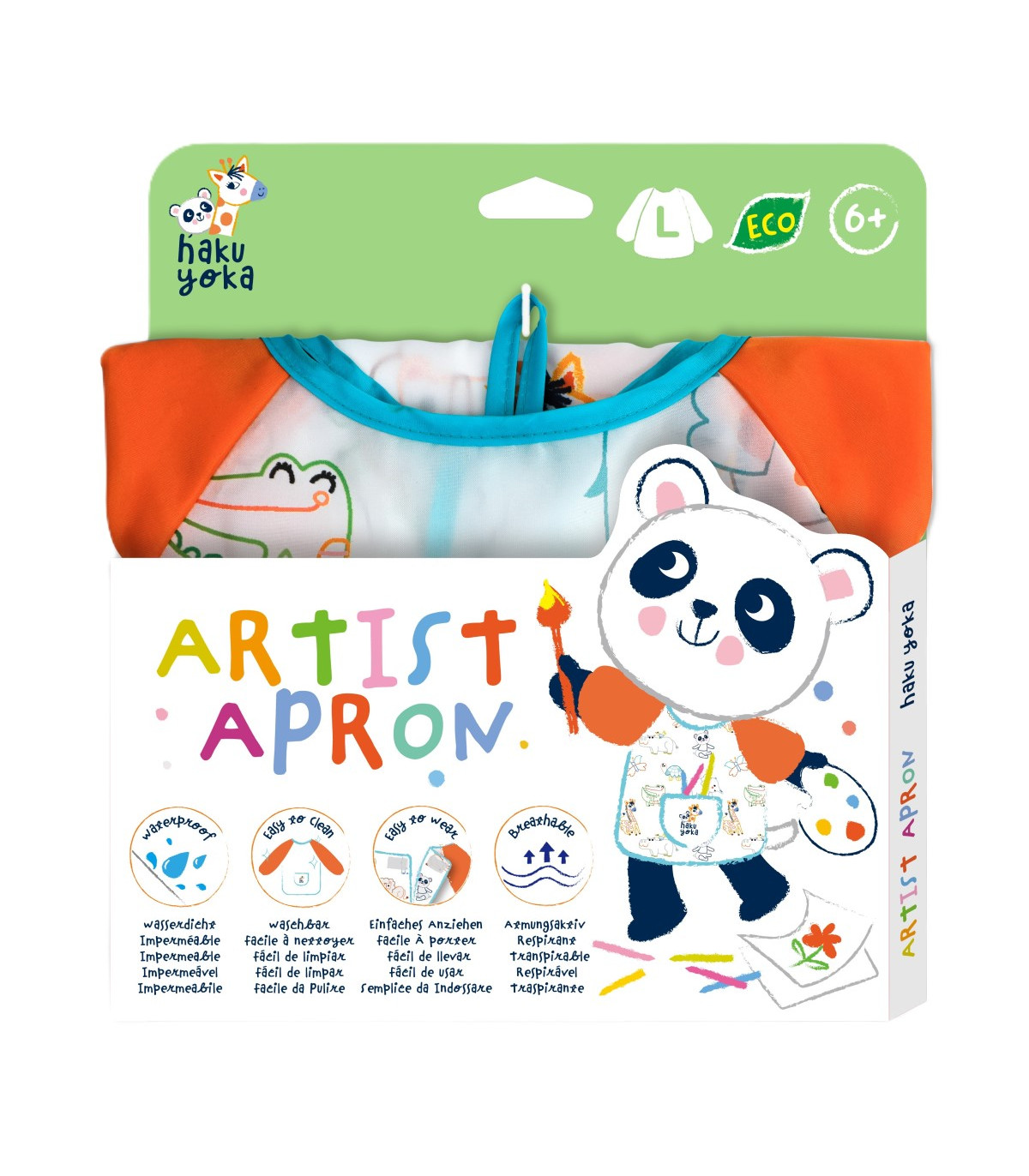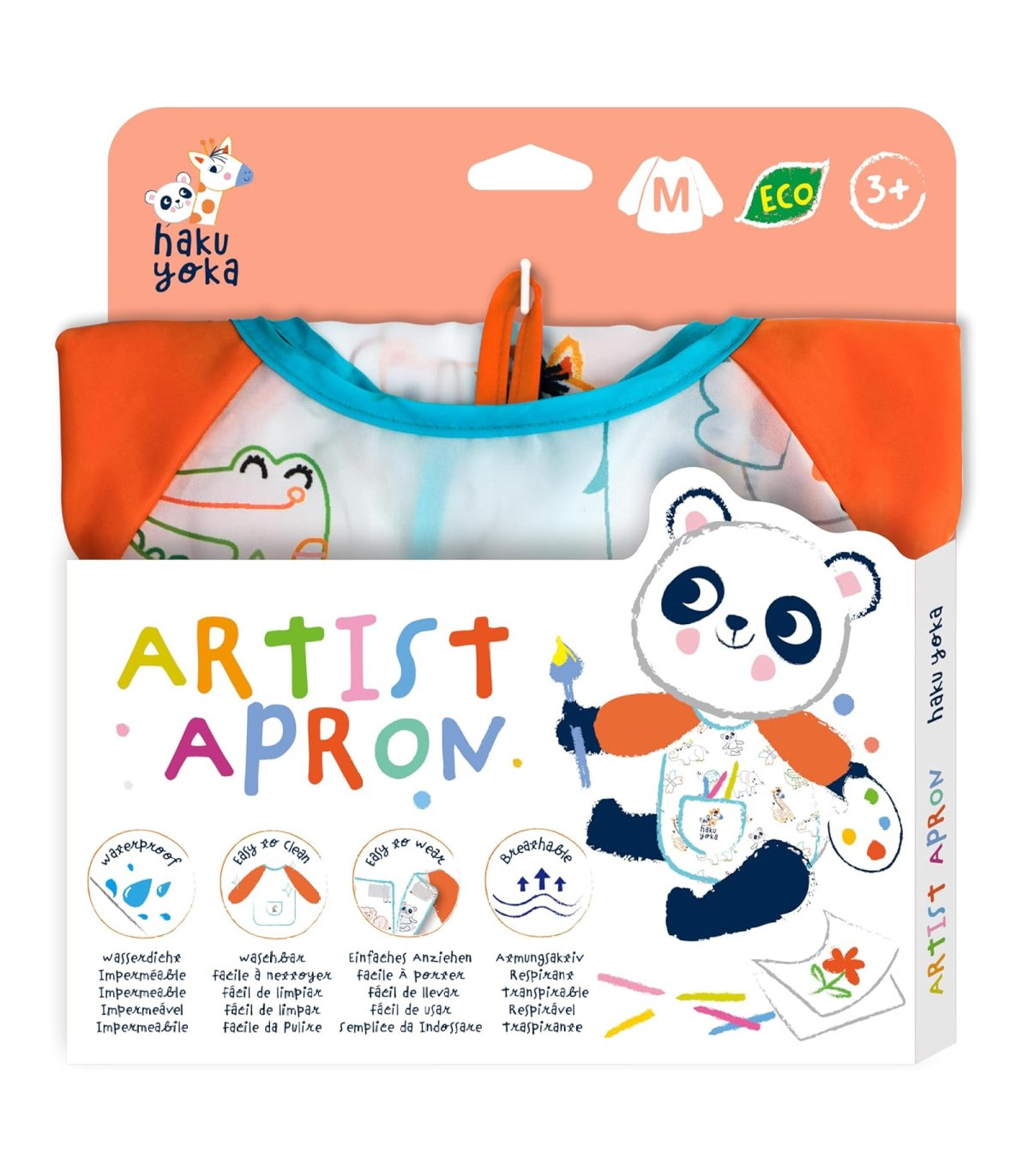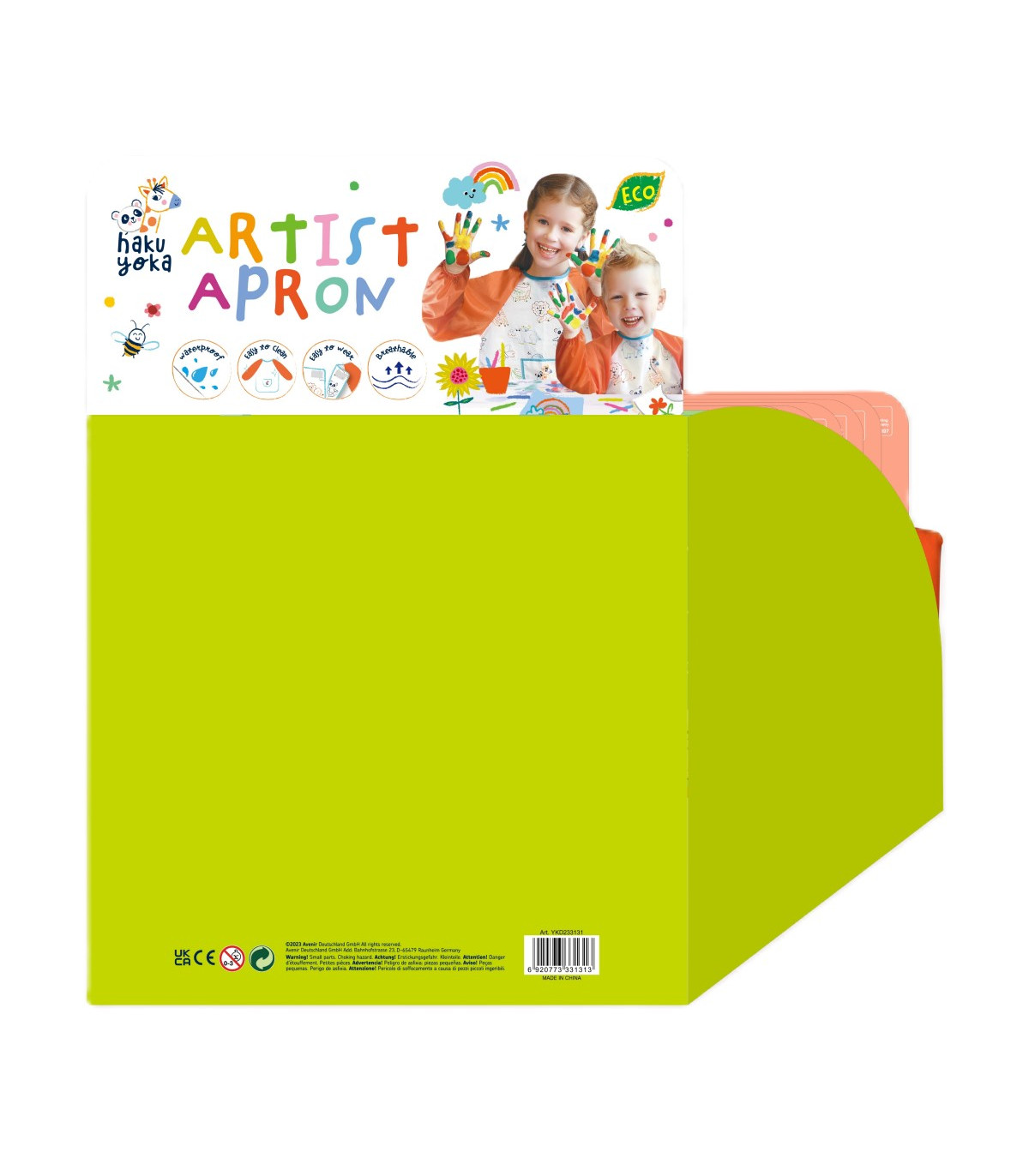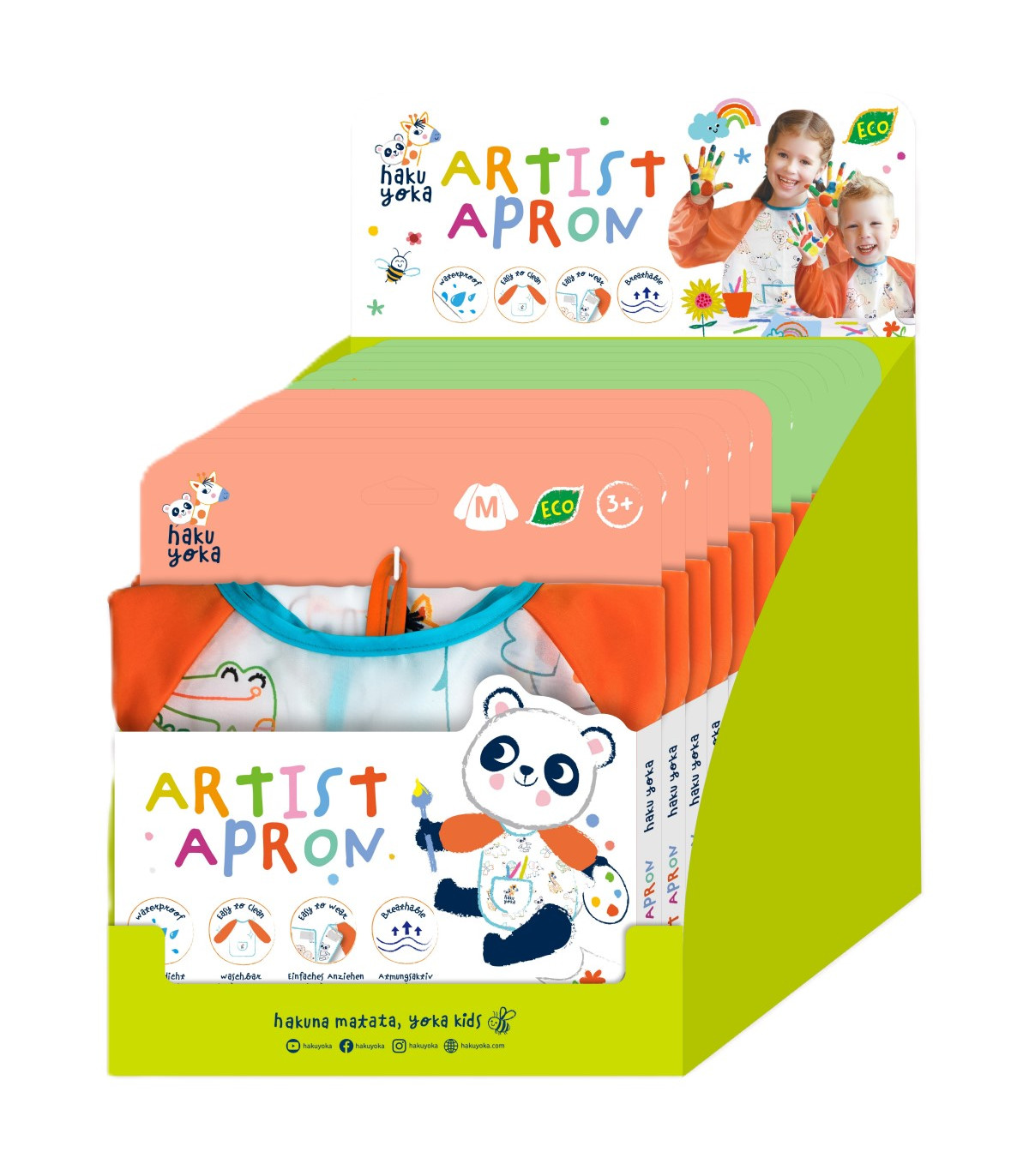 Un exhibidor con 12 delantales de artista en 2 talles surtidos, M y L. Cada delantal es impermeable pero respirable con mangas largas que se cierran en las muñecas. Fácil de poner y quitar, y de limpiar después de su uso.