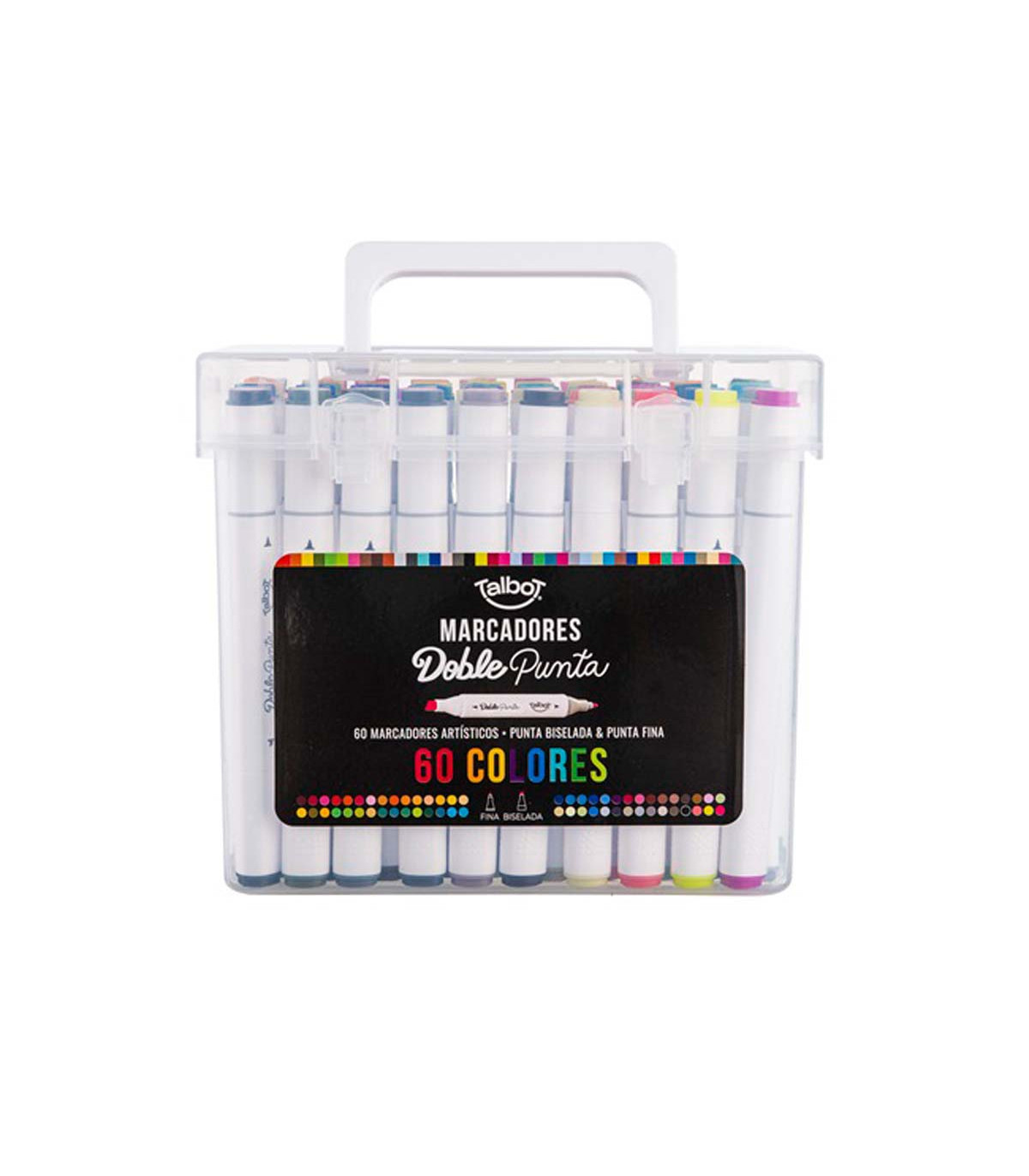 Un estuche plástico con 60 marcadores de colores Talbot de doble punta, fina de 1 mm y biselada de 6 mm. Tinta a base de alcohol. Apto para papel, plástico, vidrio, textil, acero, caucho, madera y cartón. Pueden mezclarse colores para lograr transiciones.