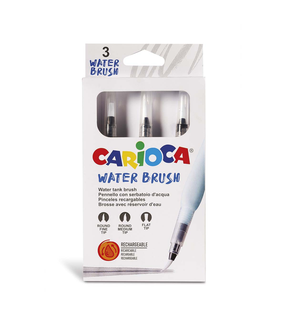 Tres pinceles recargables con agua. Uno de punta fina, otro de punta mediana y otro de punta chata. Depósito facil de cargar. Se presiona el cuerpo para activar el flujo de agua.