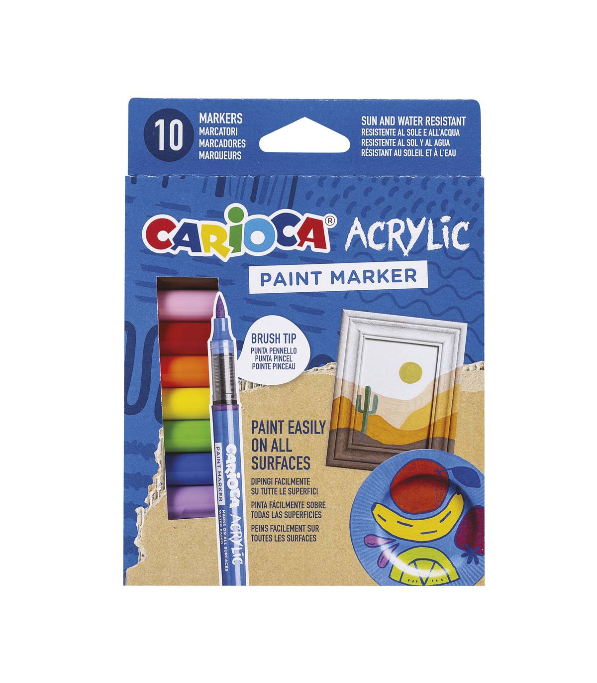 Una caja con 10 marcadores acrílicos de punta pincel para pintar en cualquier superficie. Tinta resistente a la luz y al agua.