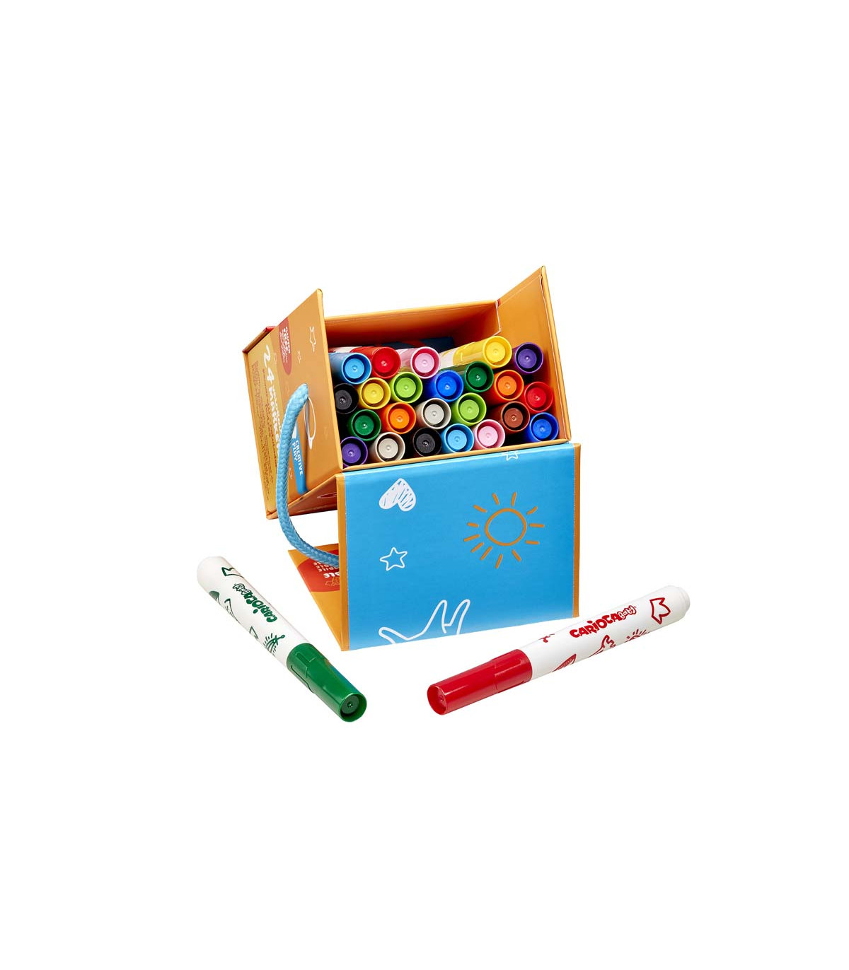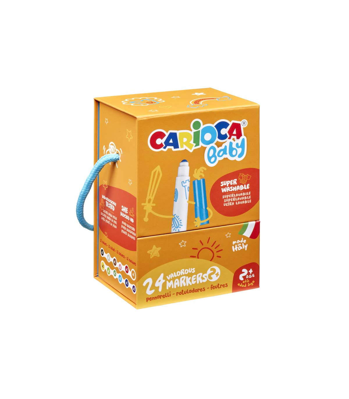 Una caja de 24 marcadores Baby con punta bloqueada segura para bebés desde 24 meses. Tinta no tóxica, con colorantes alimentarios y dermatológicamente testeada. Colores brillantes. Capuchón ventilado anti-asfixia.