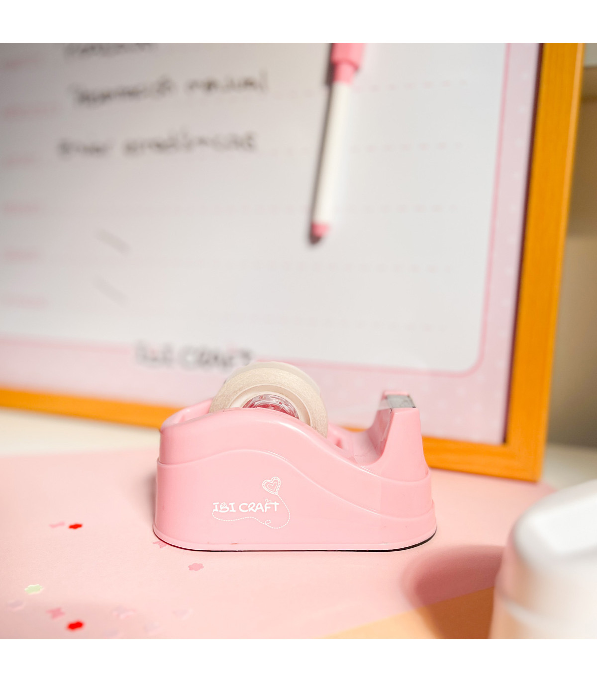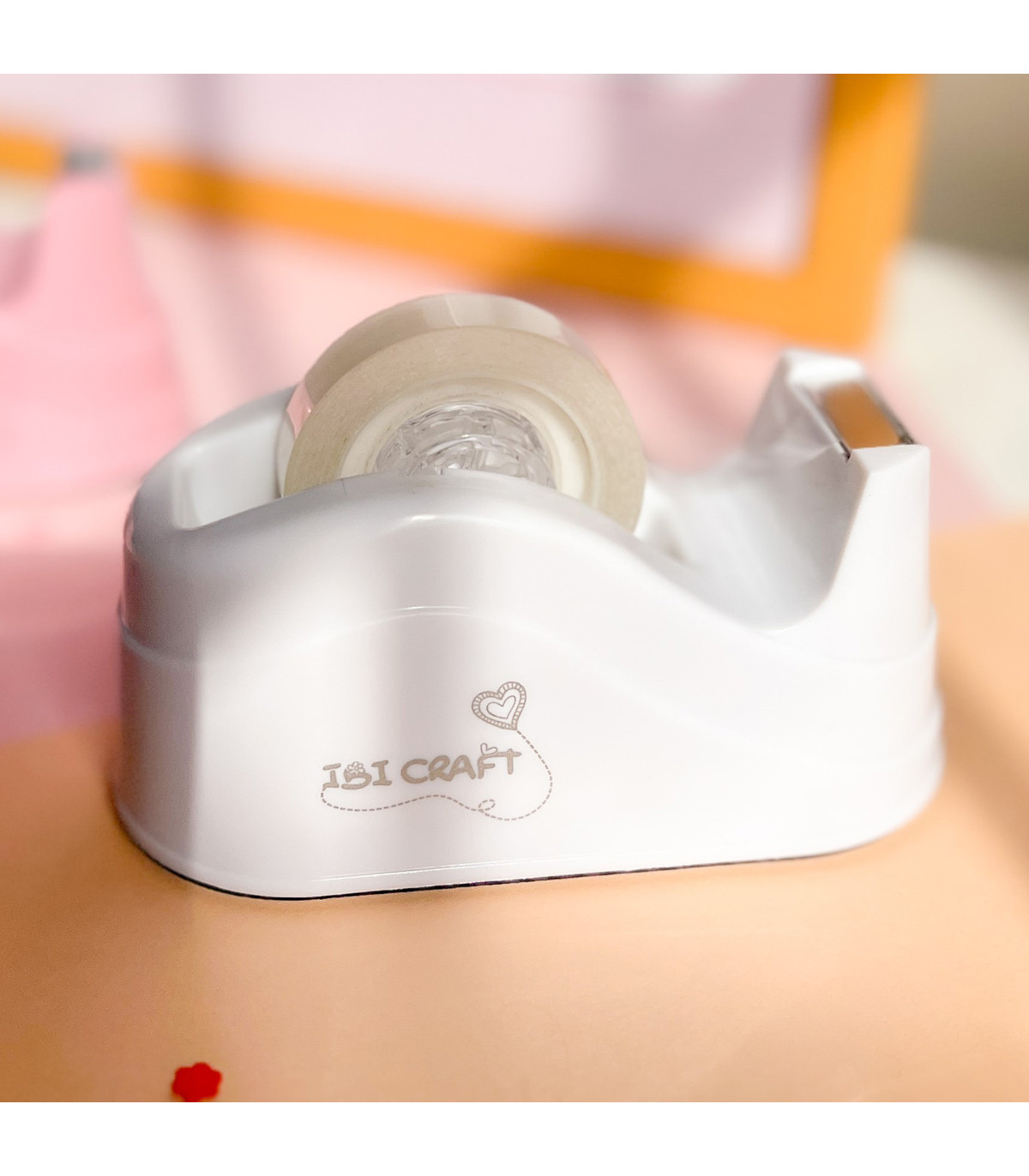 Un práctico portarrollo de escritorio de cinta adhesiva con el cuidado diseño de Ibicraft que incluye un cortador dentada para racionarla.