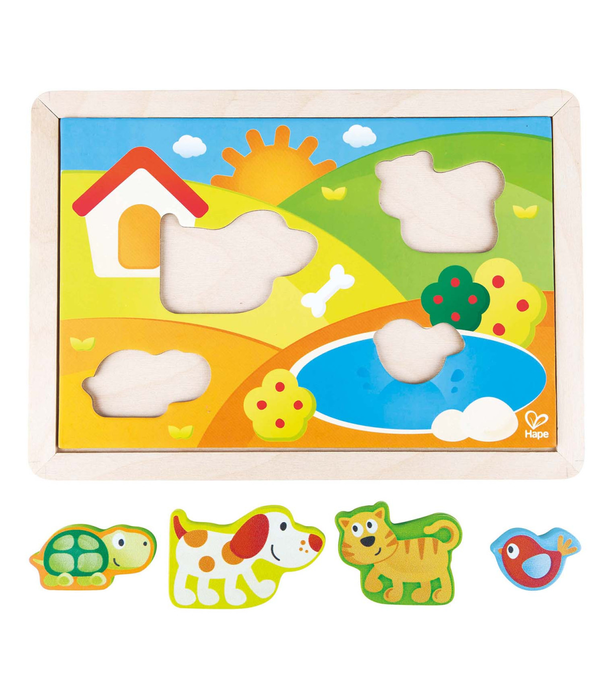 Pasá un día en el mundo de Pepe. Este rompecabezas 3 en 1 de madera presenta tres placas base diferentes con piezas cambiantes para cada escena.