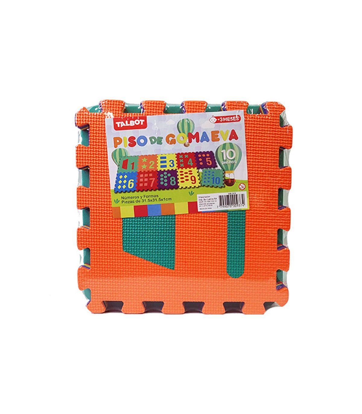 10 piezas encastrables de goma eva de 31,5 cm cada una, para armar un piso de 1,57 m x 63 cm con formas y números del 1 al 10. Ideal para que los chicos aprendan a contar y sobre las formas geométricas básicas.