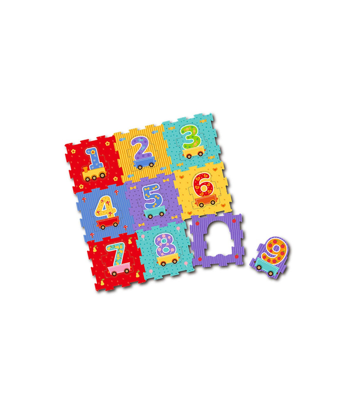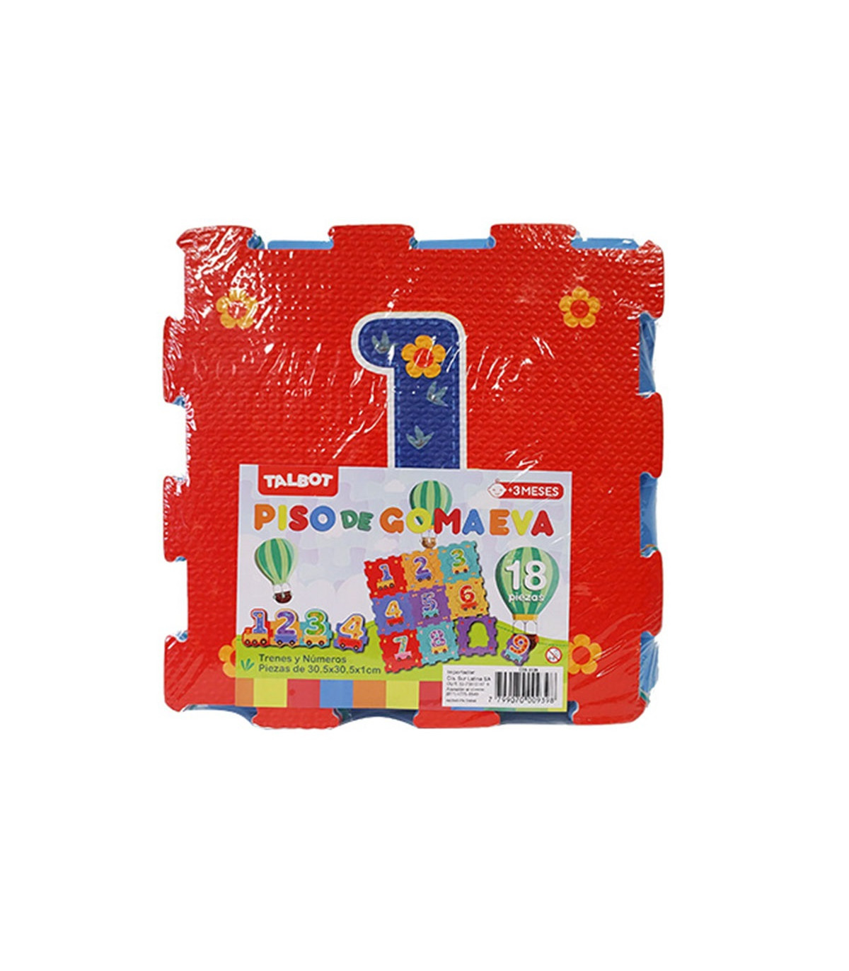 18 piezas de goma eva para armar un piso de 94x94 cm con un tren de números. Los vagones con números pueden encastrarse en sus marcos o entre sí como un rompecabezas. Estimula la motricidad fina de los más chicos y la identificación de números y colores.