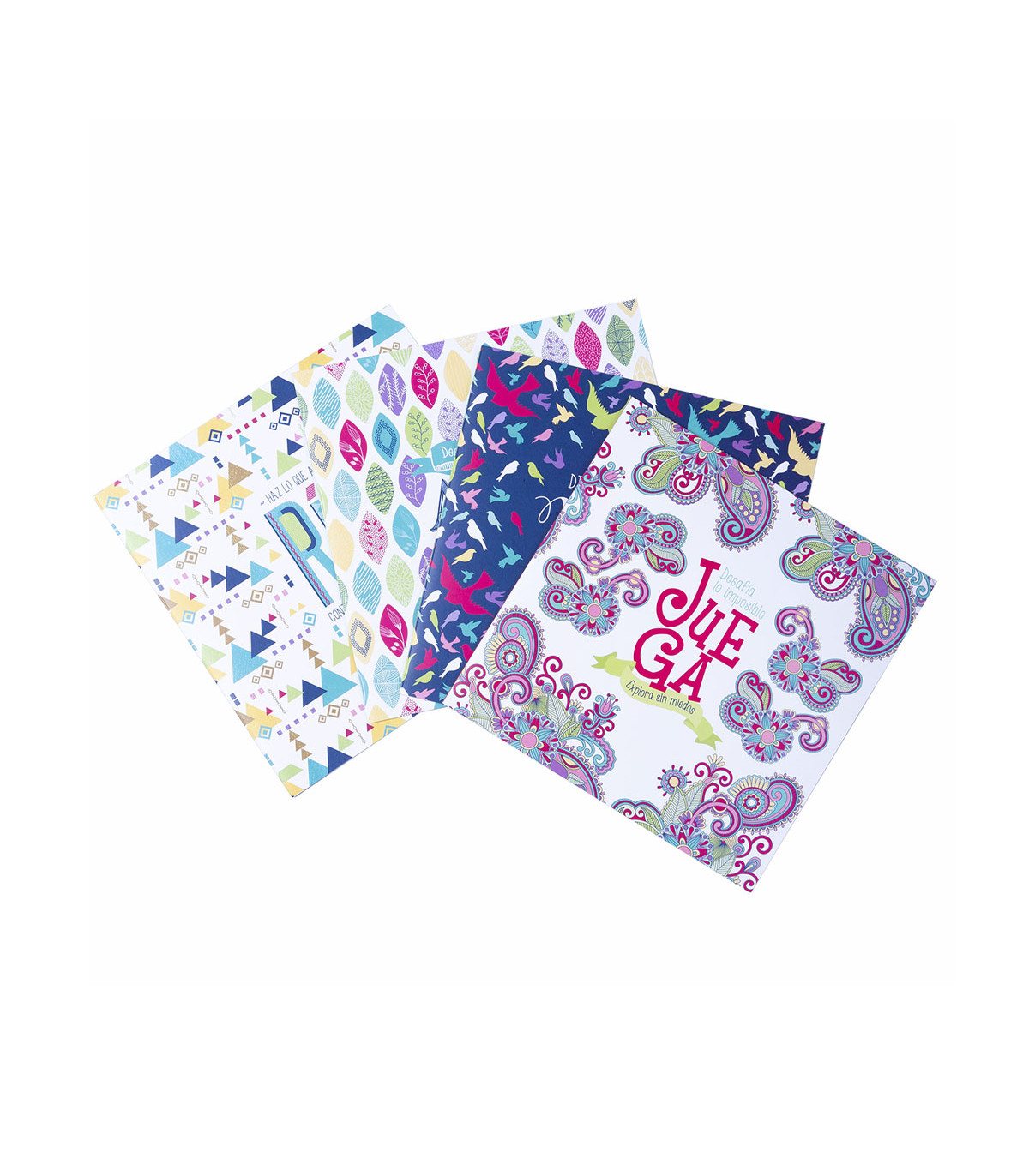 Un set de 12 tarjetas con stamping tipo libro de papel ilustración de 115g, tapa y contratapa. Diseño surtido de rayas y lunares. Incluye un sobre blanco.