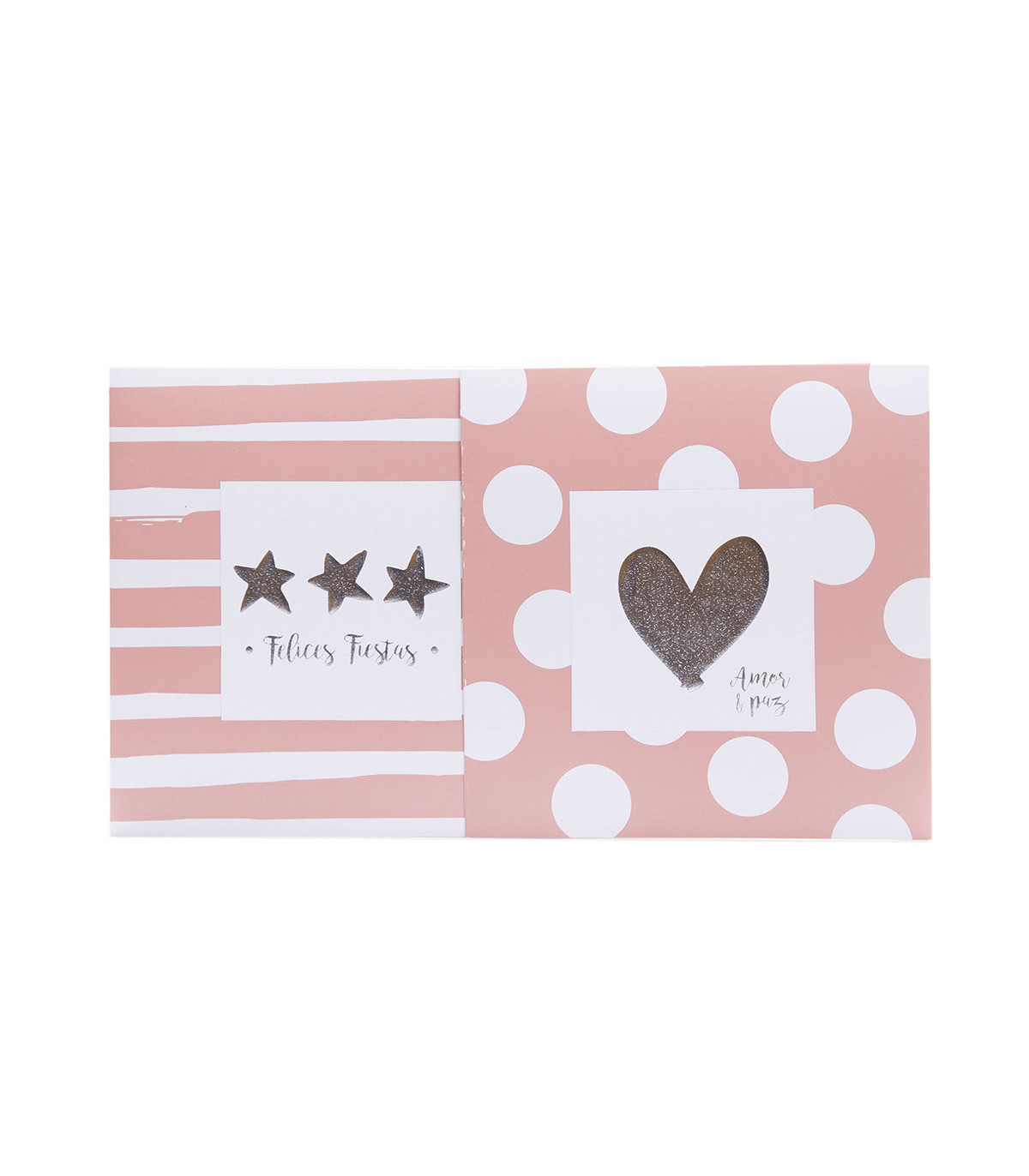 Un set de 12 tarjetas con stamping tipo libro de papel ilustración de 115g, tapa y contratapa. Diseño surtido de rayas y lunares. Incluye un sobre blanco.