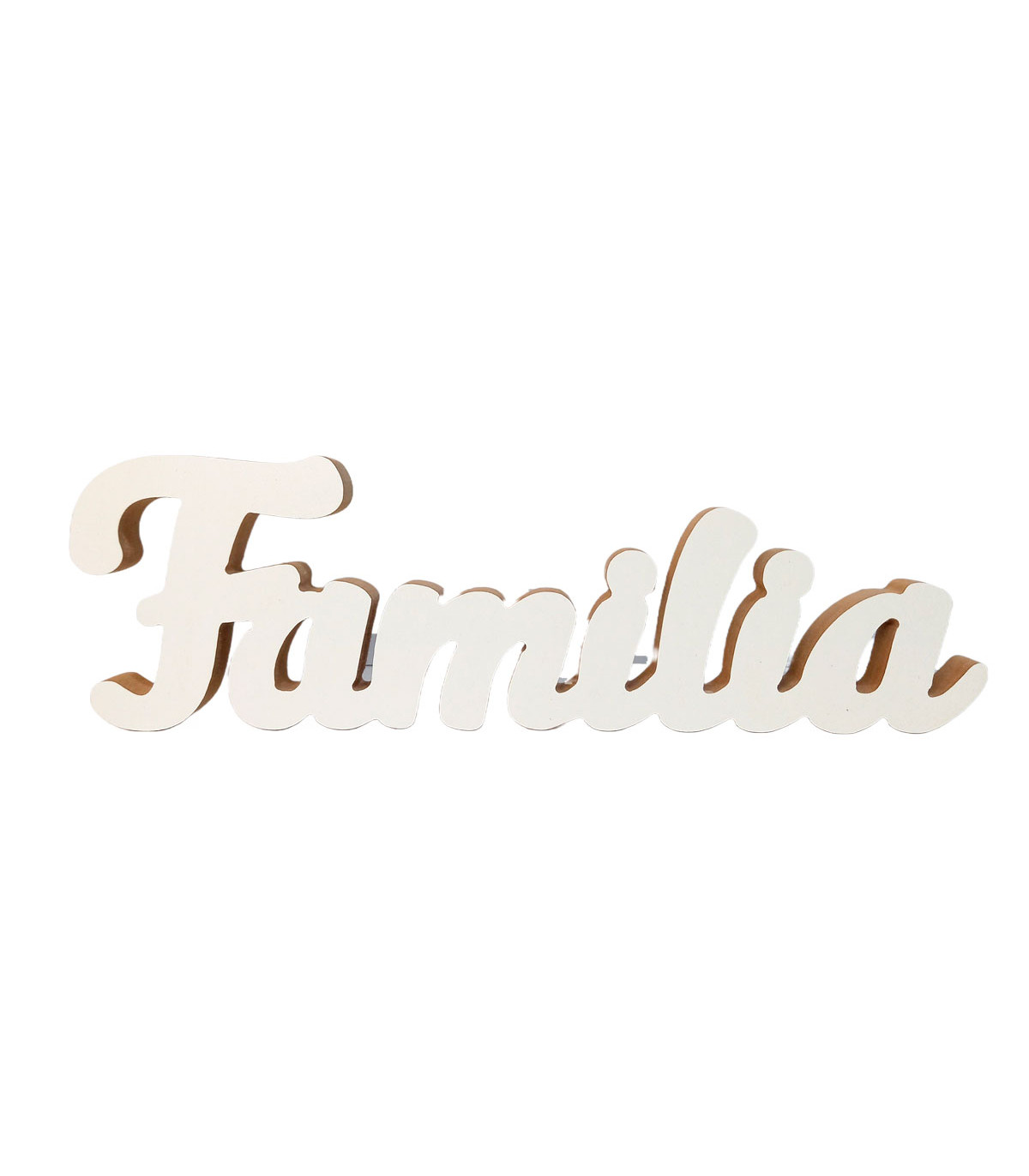 Un adorno de la palabra Familia de 30 cm de ancho y 9 cm de alto. Hecho en madera recuperada de los sobrantes de muebles hechos a medida.