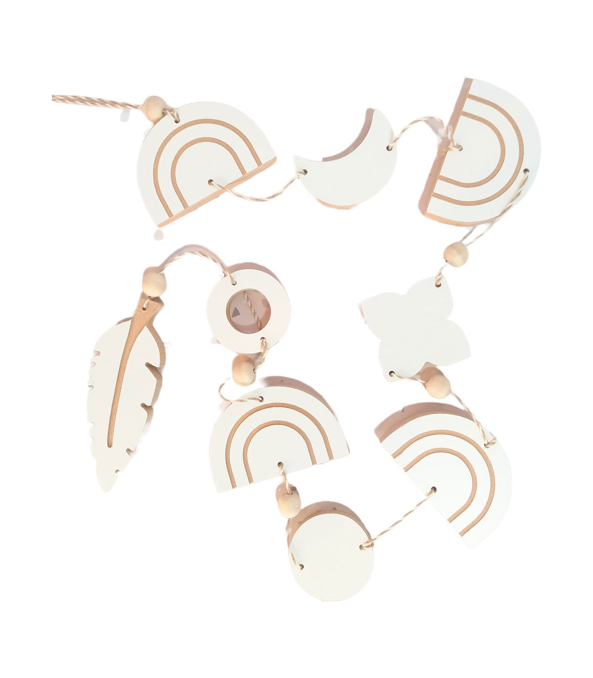 Una guirnalda de 1,5 metros de largo con 9 formas de madera de aproximadamente 7 x 7 cm y 5 bolitas de madera. Hechas en madera recuperada de los sobrantes de muebles hechos a medida.