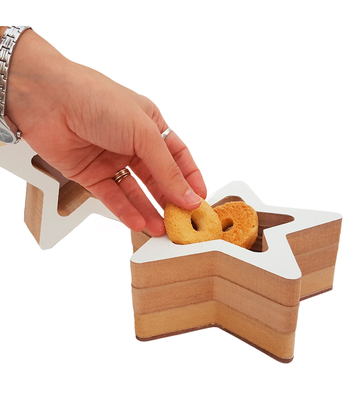 8 adornos de madera melamina con forma de estrella de 2 cm de espesor con una estrella en caja de cartulina. Color Helsinki o blanco. Hechos en madera recuperada de los sobrantes de muebles hechos a medida.