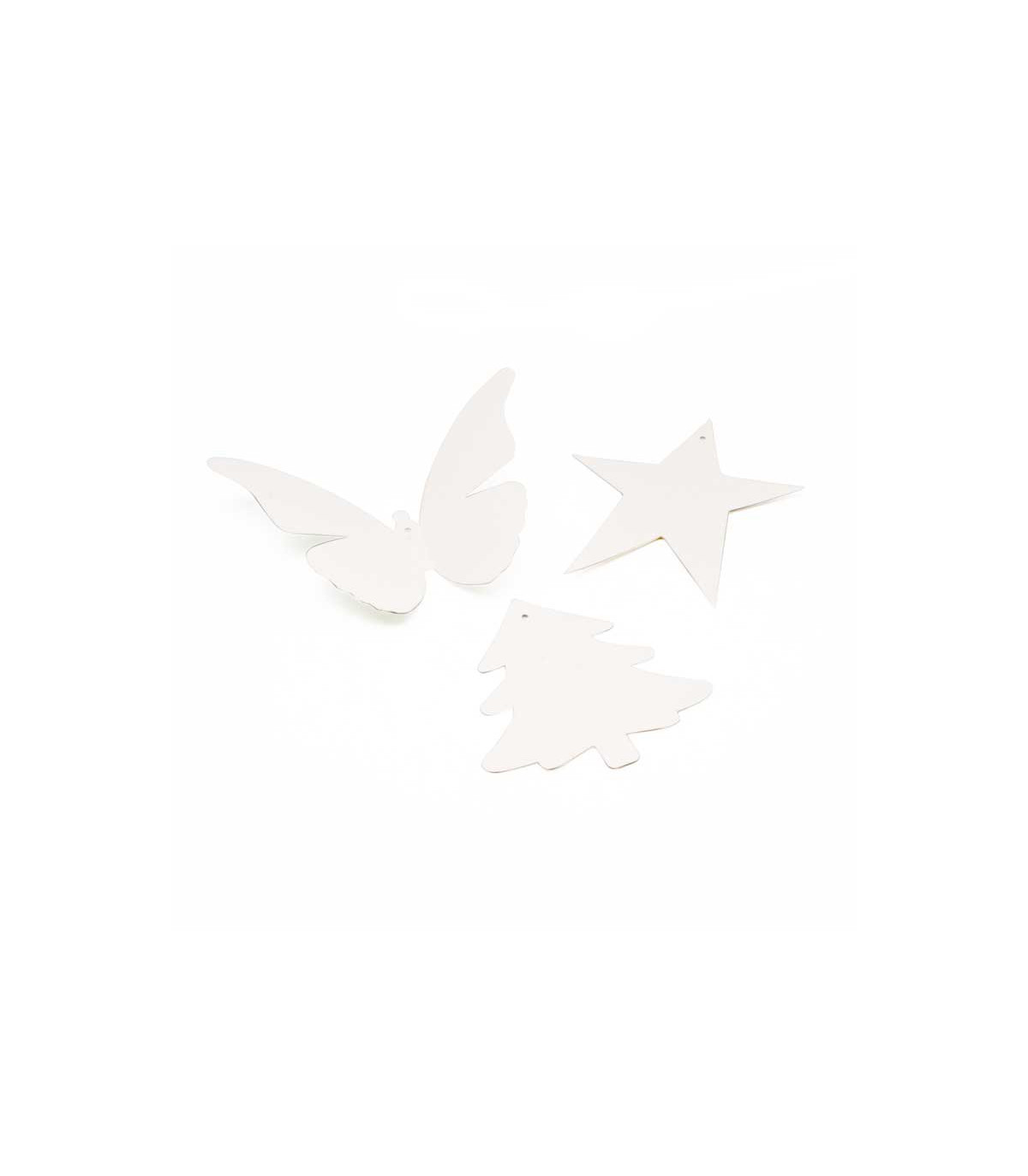 Adorno de madera blanco de 8 cm de alto con forma de estrella con tres diseños distintos. Ideal para decorar el árbol de Navidad. Incluye hilo para colgar.
