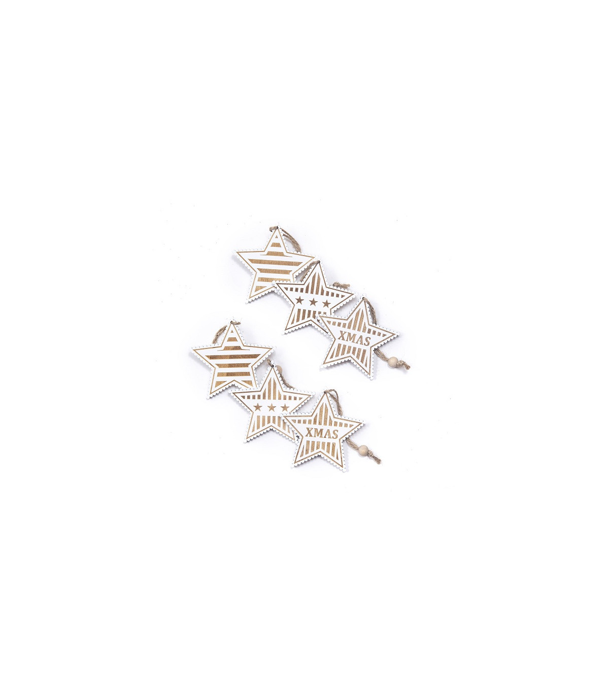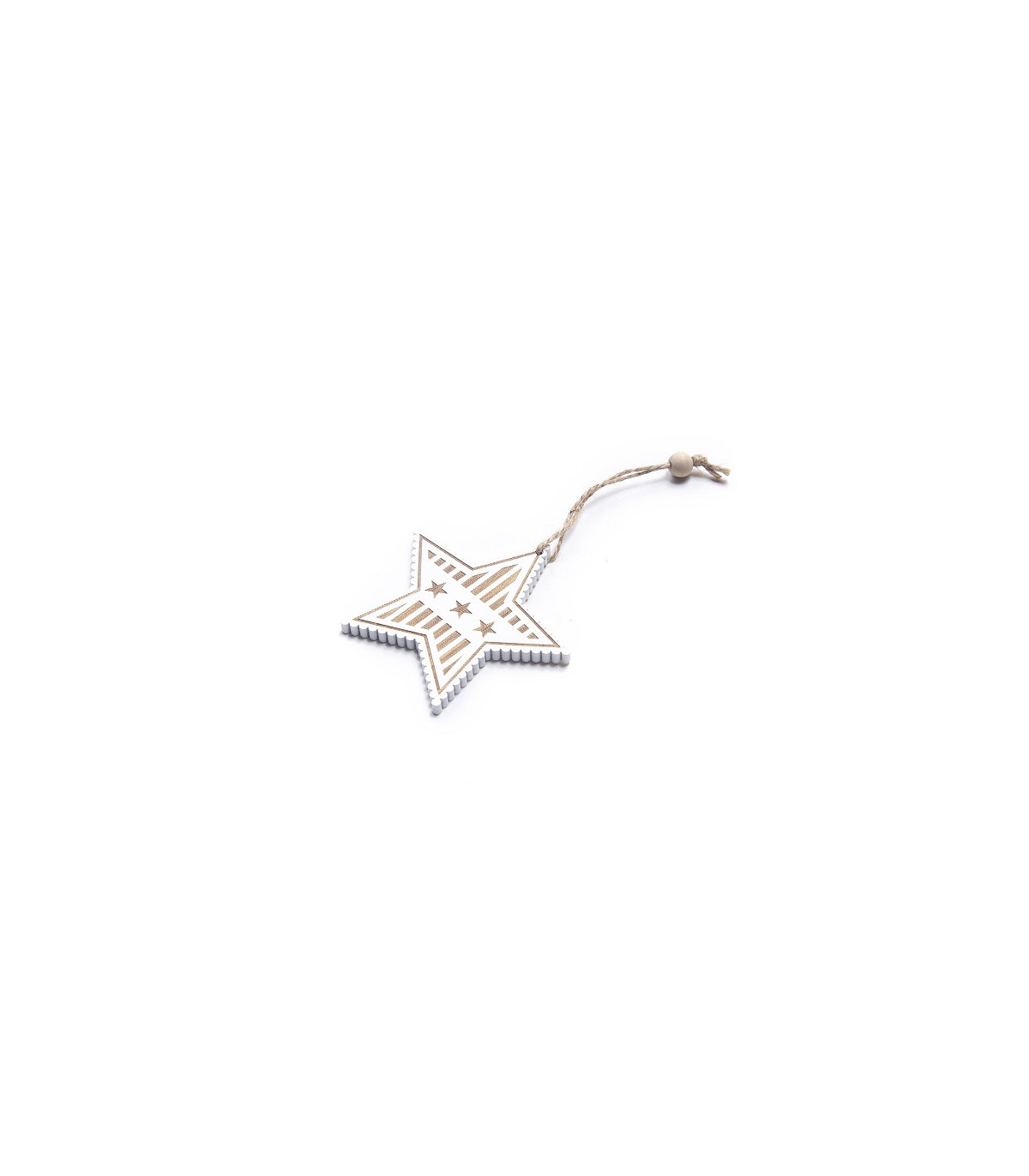 Adorno de madera blanco de 8 cm de alto con forma de estrella con tres diseños distintos. Ideal para decorar el árbol de Navidad. Incluye hilo para colgar.