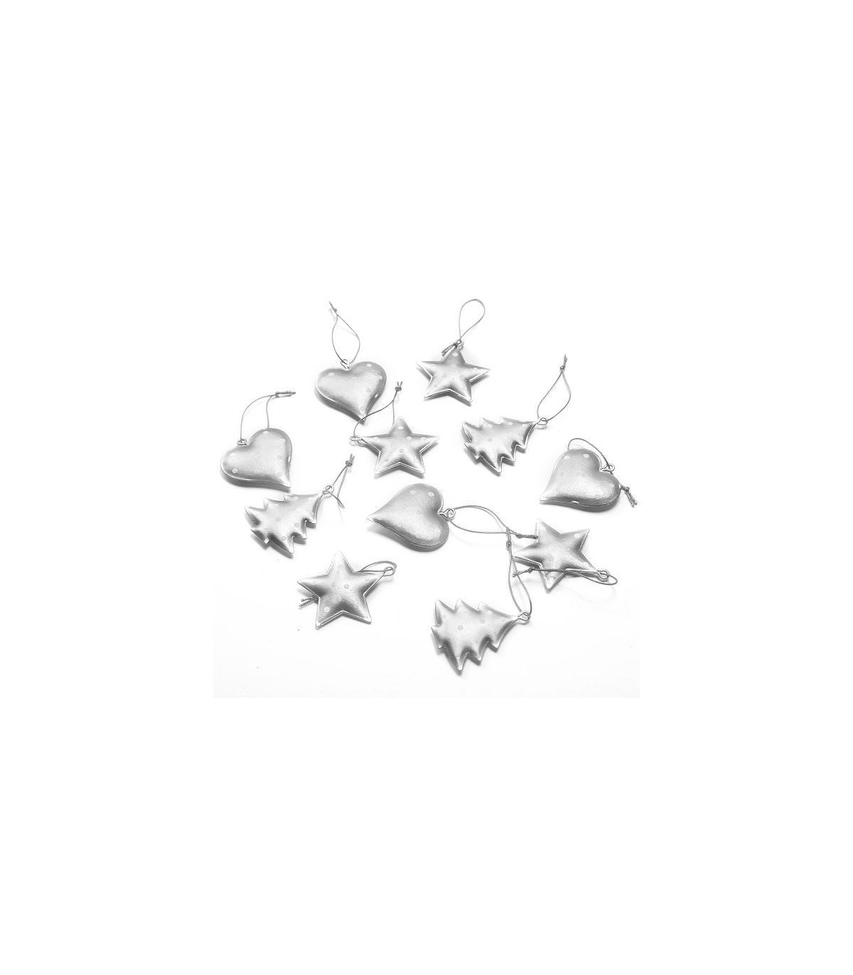 Una caja de acetato transparente con 12 adornos de metal plateados con lunares blancos de 5 cm de alto con forma de corazón, estrella y pino. Ideal para colgar en el árbol de navidad. Incluye hilo para colgar.
