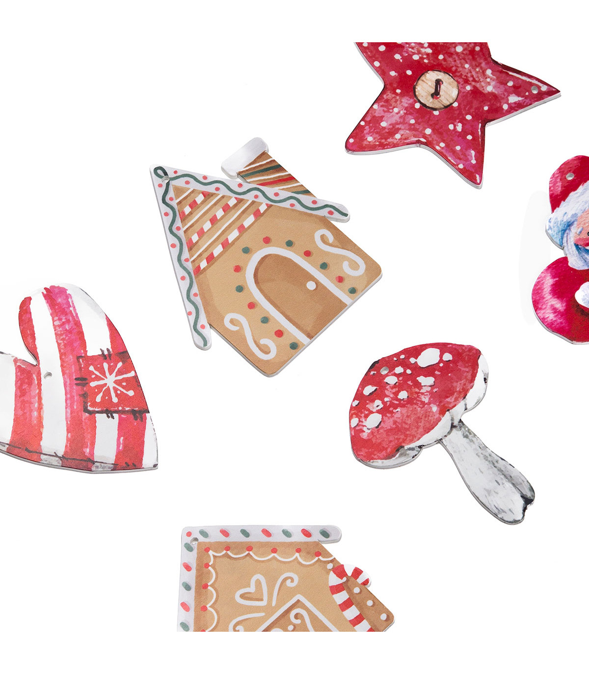 Un adorno plano de madera contrachapada para decorar el árbol de Navidad. El mínimo de compra de 56 unidades viene en buzón exhibidor de madera de 40 x 48 cm, en 7 variedades diferentes de 8 unidades cada una.