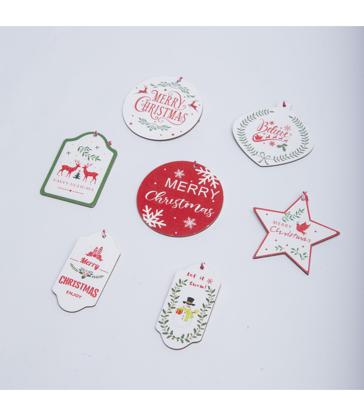 Un adorno plano de madera contrachapada para decorar el árbol de Navidad. El mínimo de compra de 56 unidades viene en árbol exhibidor de madera de 37 x 61 cm, en 7 variedades diferentes de 8 unidades cada una.