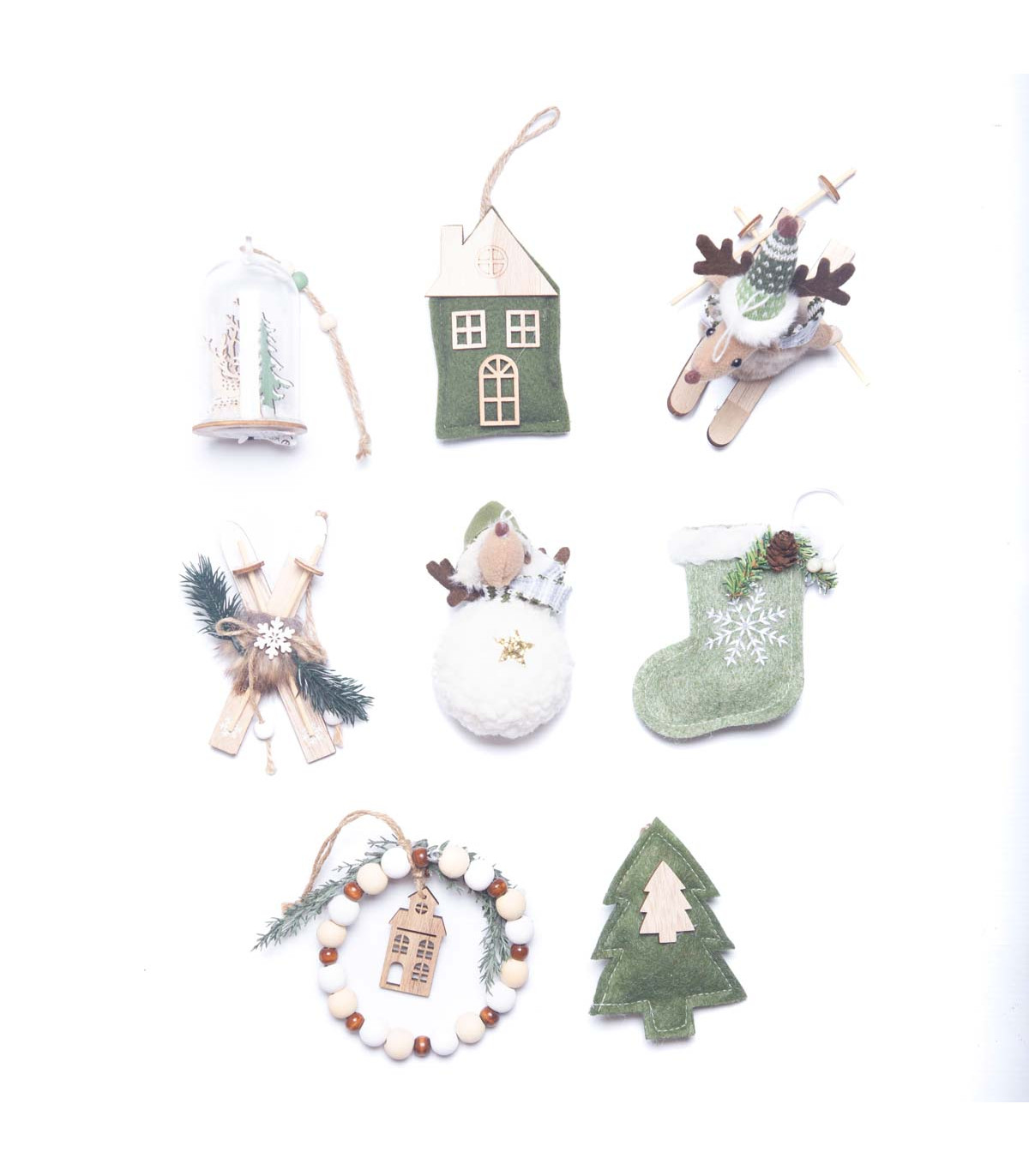 Un adorno de madera para colgar de 12 cm de alto en madera, poliester, poliestireno y PET. 8 diseños en tonos verdes: gnomo con esquíes, reno con esquíes, trineo, casita, regalo, hongo, gnomo con sombrero, reno. Ideal para decorar el árbol de Navidad.