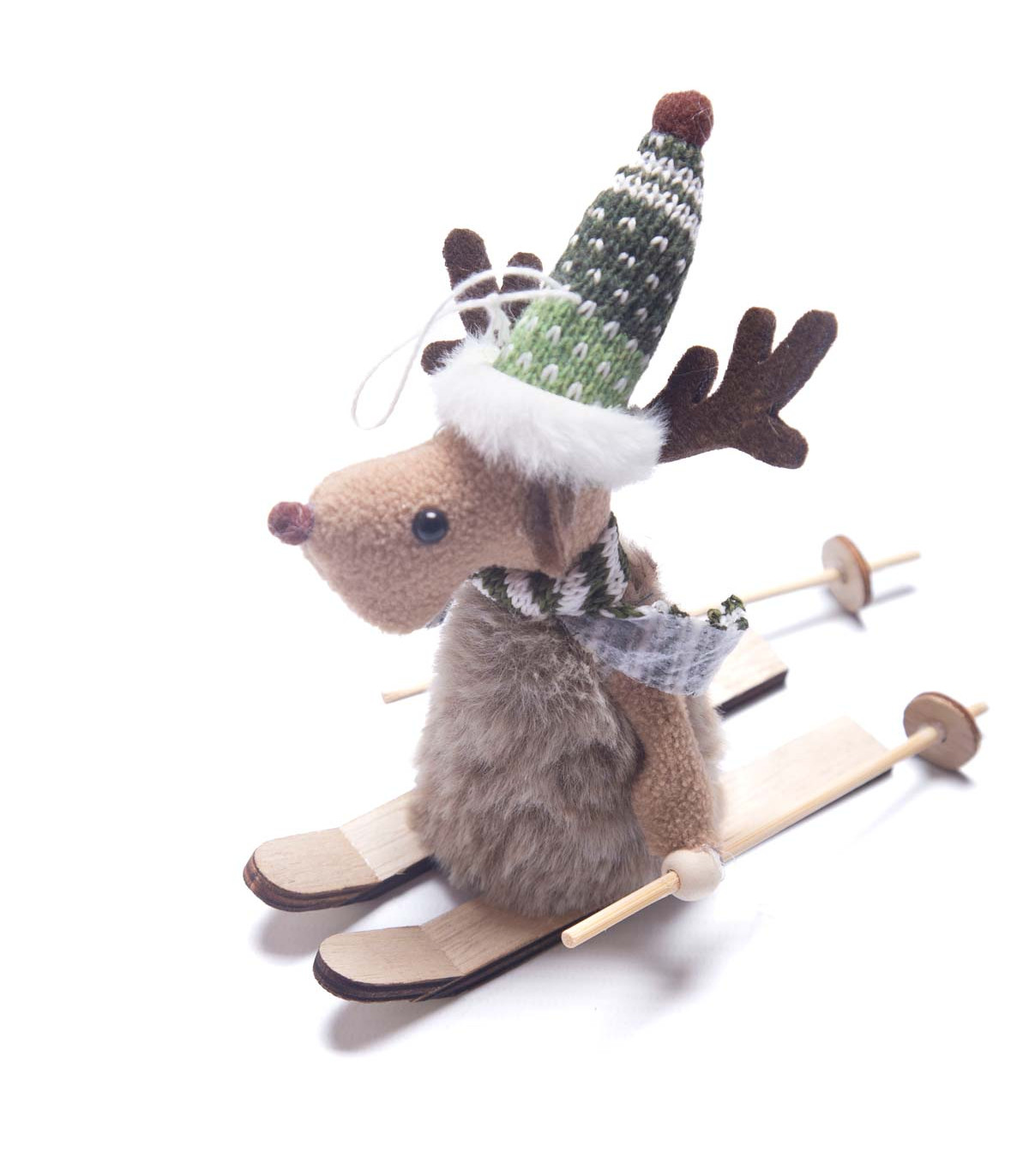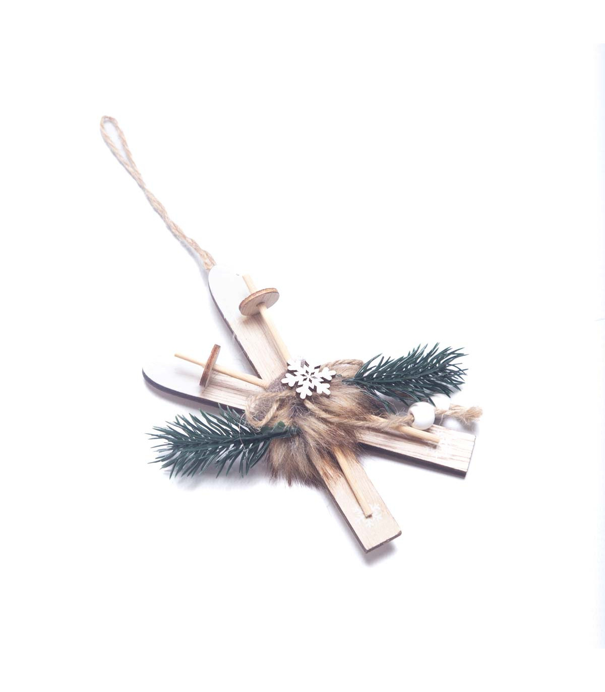 Un adorno de madera para colgar de 12 cm de alto en madera, poliester, poliestireno y PET. 8 diseños en tonos marrones: gnomo con esquíes, reno con esquíes, trineo, casita, regalo, hongo, gnomo con sombrero, reno....